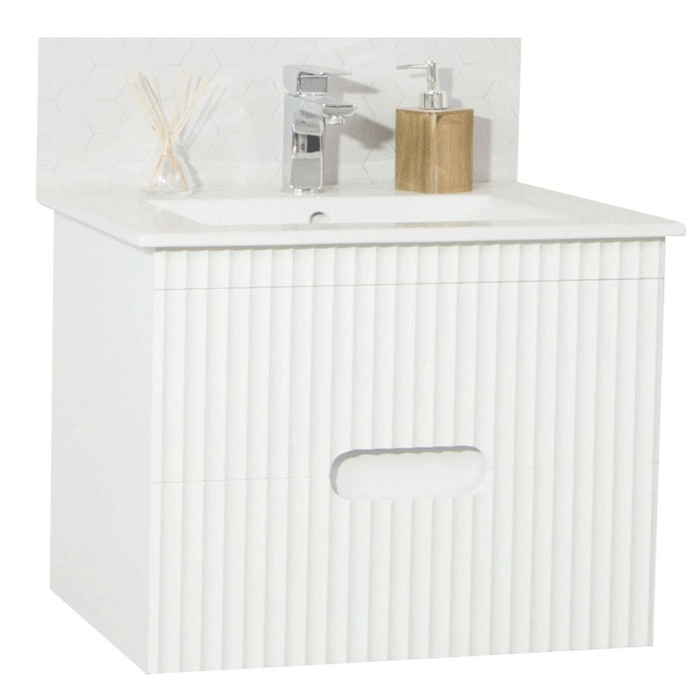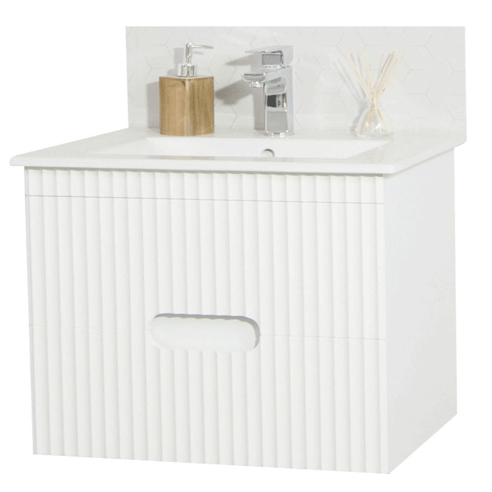 Elementul distinctiv al acestui set de mobilier baie este frontul riflat din MDF vopsit. Acest detaliu subtil, dar de mare impact vizual, adauga textura si profunzime, transformand mobilierul intr-o piesa centrala a decorului tau contemporan. Designul suspendat, pe langa contributia estetica, ofera iluzia unui spatiu mai generos si faciliteaza curatenia sub mobilier, un aspect esential pentru o baie moderna si minimalista.