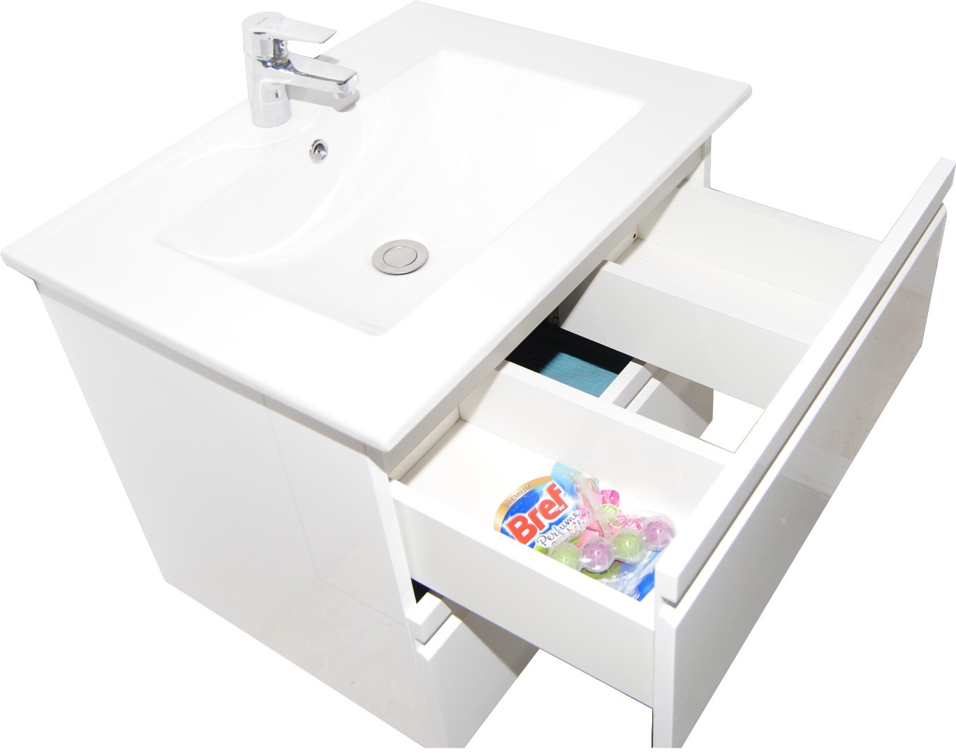 Acest set de mobilier nu este doar o piesa functionala, ci si un element de design ce ofera baii tale un aspect elegant si aerisit. Ideal pentru spatii mici sau medii, mobilierul suspendat optimizeaza fiecare centimetru, iar sertarele soft close contribuie la un confort sporit in utilizarea cotidiena. Practic si estetic, acest mobilier asigura o zona de baie organizata, curata si primitoare, perfecta pentru momentele tale de relaxare.