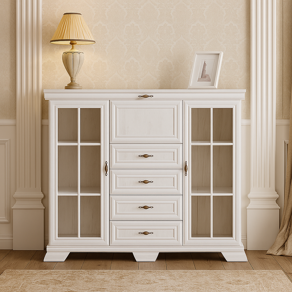 Multiplele spatii de depozitare (sertarele si politele acoperite cu geam ) va ajuta sa pastrati dezordinea sub control, depozitand toate hainele si accesoriile intr-un singur loc convenabil.Â