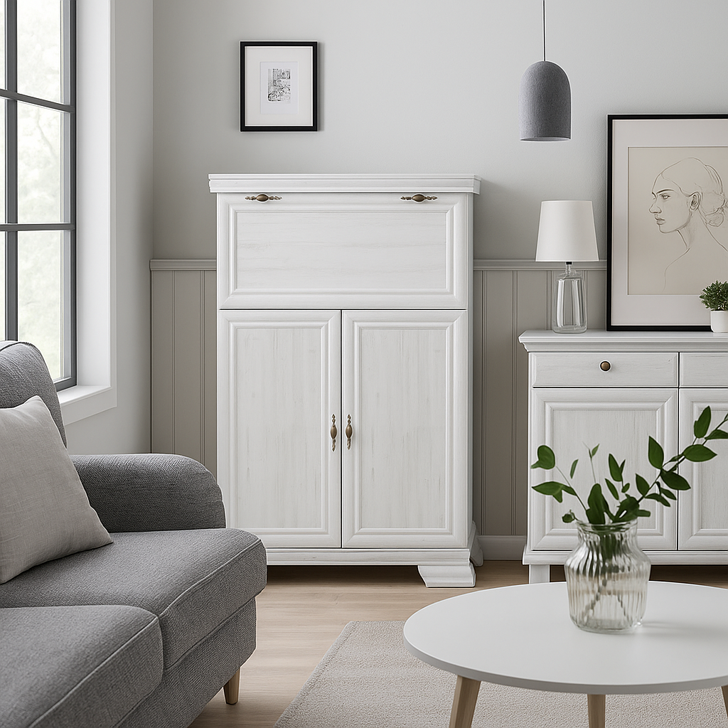 Comoda este fabricata din material PAL melaminat in culoarea alb antichizat. Este prevazuta cu doua compartimente : cel superior cu o usa rabatabila si inferior cu doua usi ce se deschid stanga-dreapta. Compartimentul superior poate avea si destinatie de bar, fiind usor de manipulat datorita usii rabatabile.
