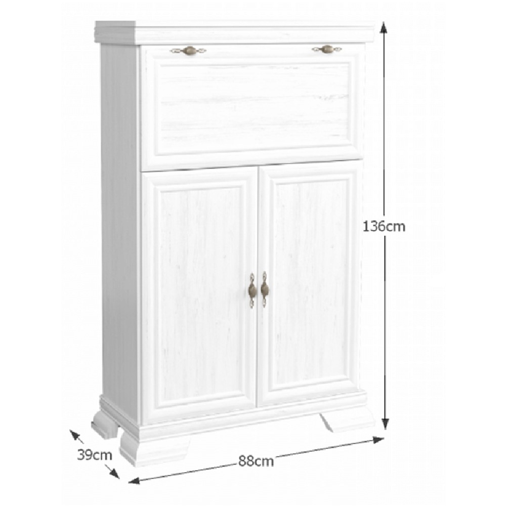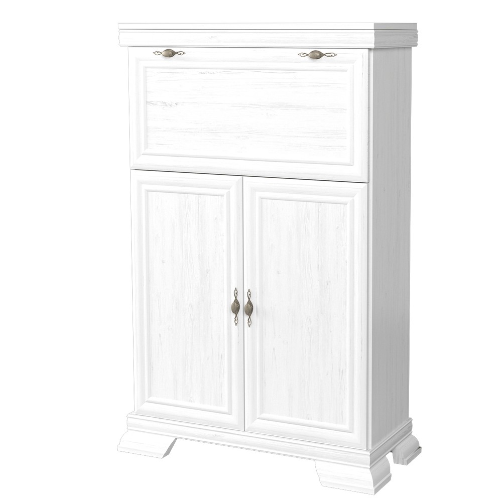 Comoda living VM5, o usa rabatabila pentru bar, 2 usi fixe, Pal Melaminat, cu elemente din MDF, Alb Antichizat
