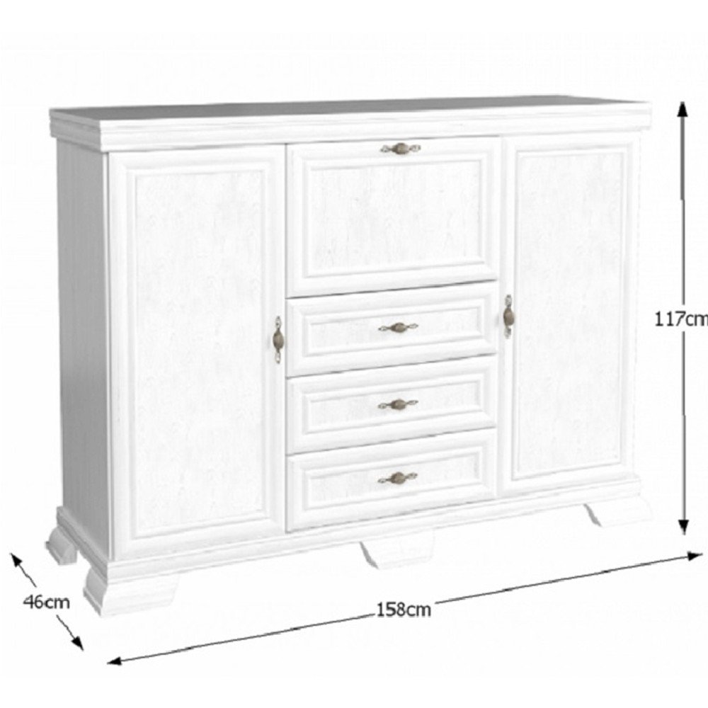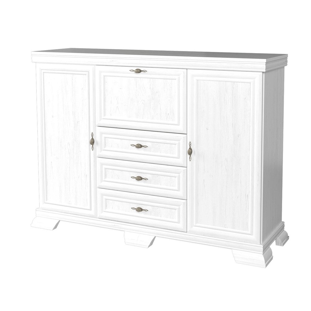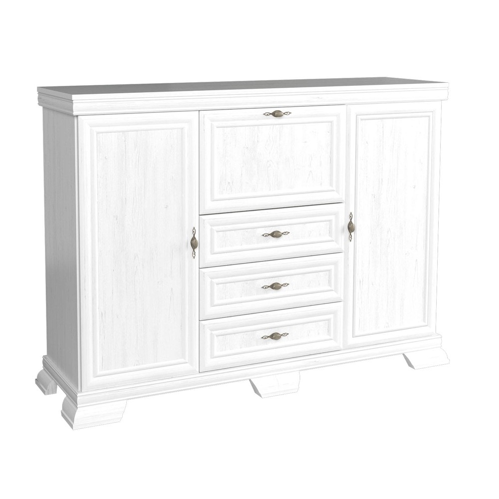 Comoda living VM6P, o usa rabatabila pentru bar, 2 usi fixe, 3 sertare, Pal melaminat, cu insertii MDF, Alb Antichizat