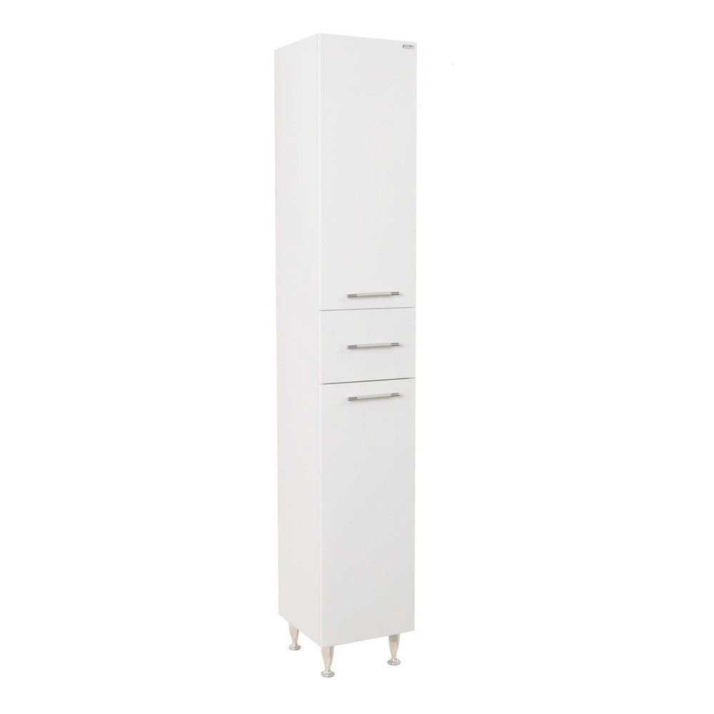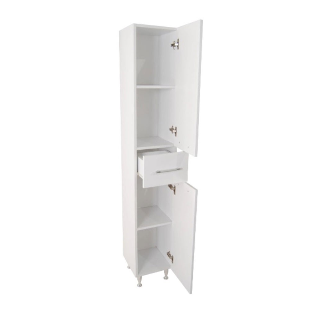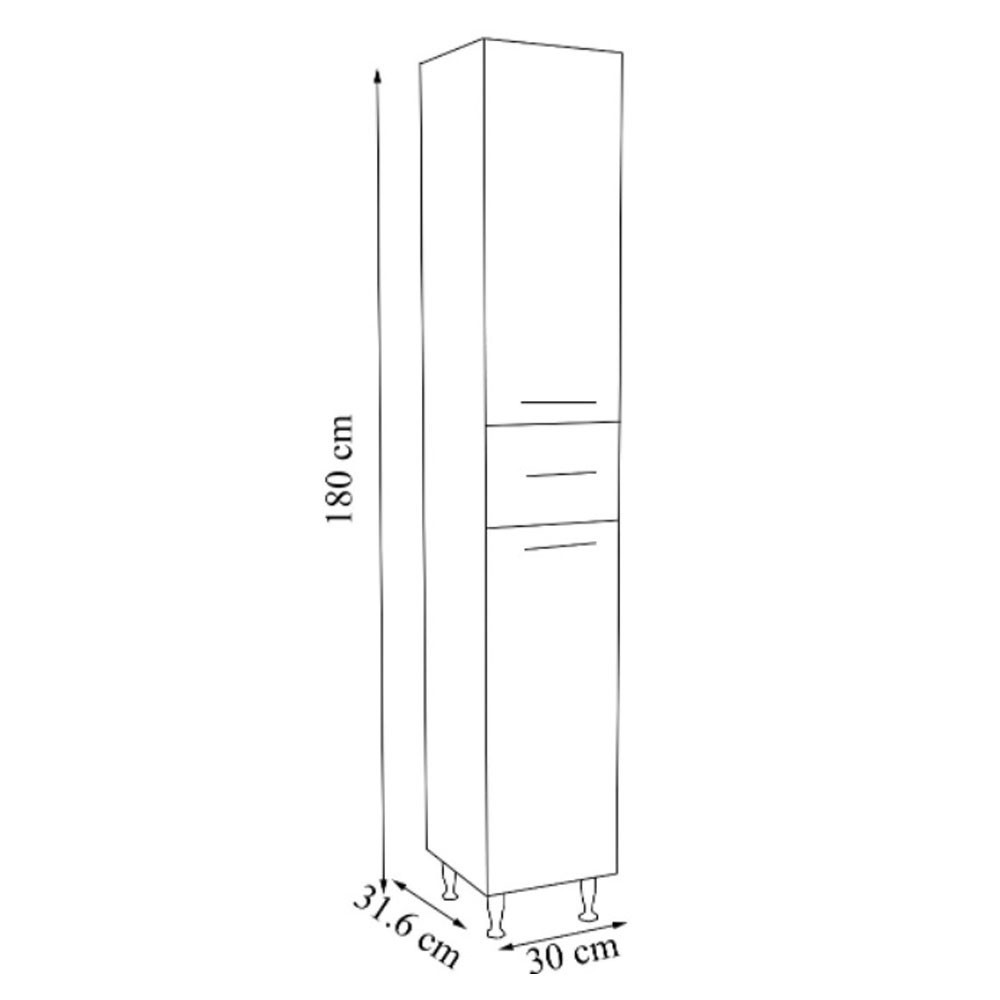 Dulapul de baie este cu picioare  si este realizat dintr-o combinatie de materiale ce asigura rezistenta la mediu umed: Fata sa este realizata din placi MDF rezistente la apa, acoperite cu lac alb de inalta calitate. in profil sunt montate manere moderne. Dulapul inalt este dotat cu un sertar si doua usi care faciliteaza organizarea spatiului in fiecare baie