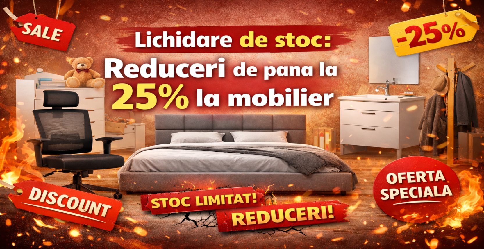 Achizitia produselor aflate la lichidare de stoc este una dintre cele mai inspirate decizii atunci cand vrei sa iti reamenajezi locuinta fara a depasi bugetul. La Drimus, iti oferim discounturi de pana la 25% la o selectie variata de produse din categoriile: scaune de birou, paturi, mobilier pentru copii, mobilier de baie si cuiere.