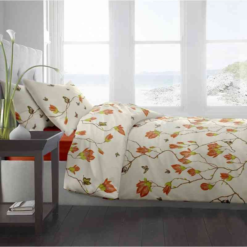 Lenjeria este disponibila cu imprimeuri florale si geometrice in culori vesele.