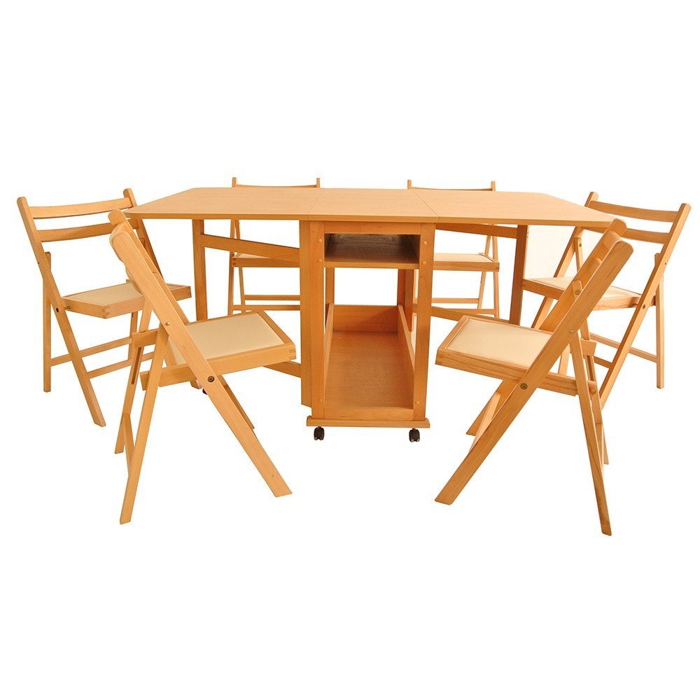 Set masa plianta cu spatiu depozitare Util, pentru living si bucatarie, PAL, structura lemn masiv, cu role, 160x96x80 cm si 6 scaune pliante, tapitate, piele ecologica, nuc