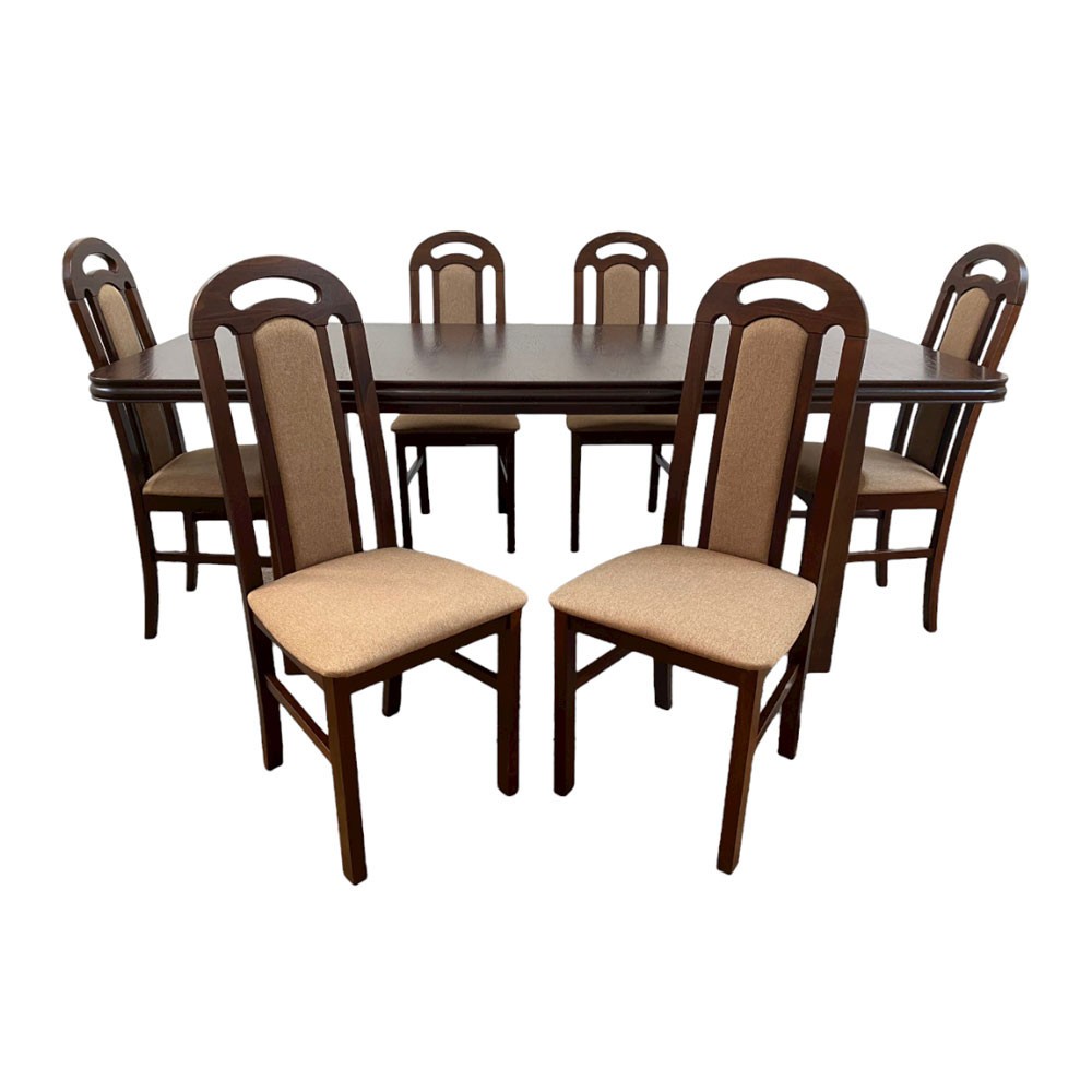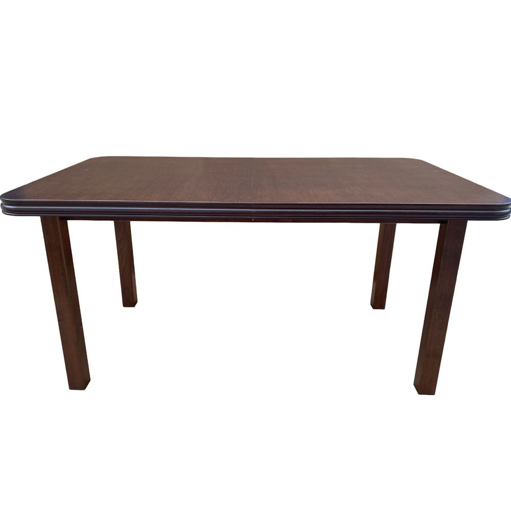 Masa extensibila Varus nuc cu blat din MDF furniruit si structura din lemn masiv este o masa impunatoare, eleganta, potrivita incaperilor in stil clasic. Blaturile culiseaza pe sina metalica iar cand masa nu are extensia atasata, blaturile se prind cu un sistem metalic pentru a evita miscarea acestora. Colturile mesei sunt rotunjite.