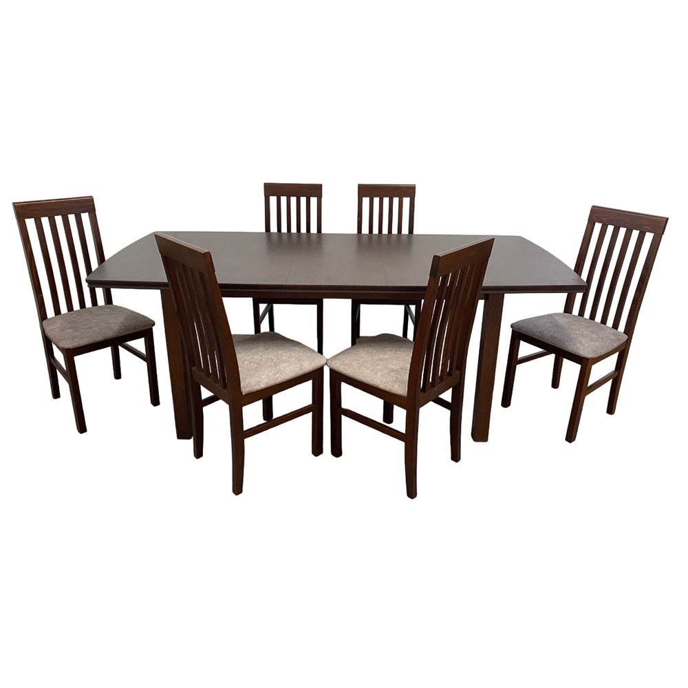 Set masa extensibila living, DM2 Bent, lemn masiv, blat MDF Furniruit, 8 persoane, 200-160x90x76 cm si 6 scaune, DM Tilo, tapitate cu stofa, 120 kg, nuc