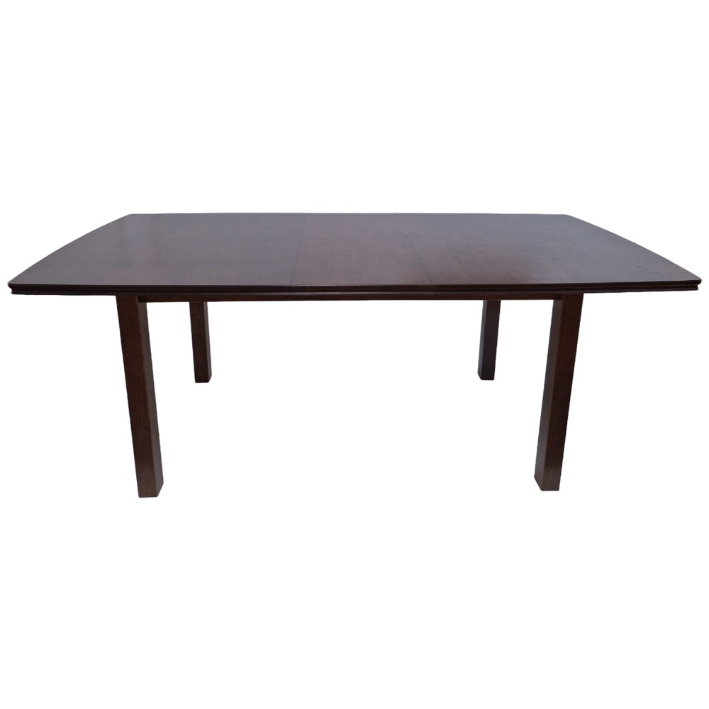 Masa extensibila Bent nuc cu blat din MDF furniruit si structura din lemn masiv este o masa impunatoare, eleganta, potrivita incaperilor in stil clasic. Blaturile culiseaza pe sina metalica iar cand masa nu are extensia atasata, blaturi se prind cu un sistem metalic pentru a evita miscarea acestora.