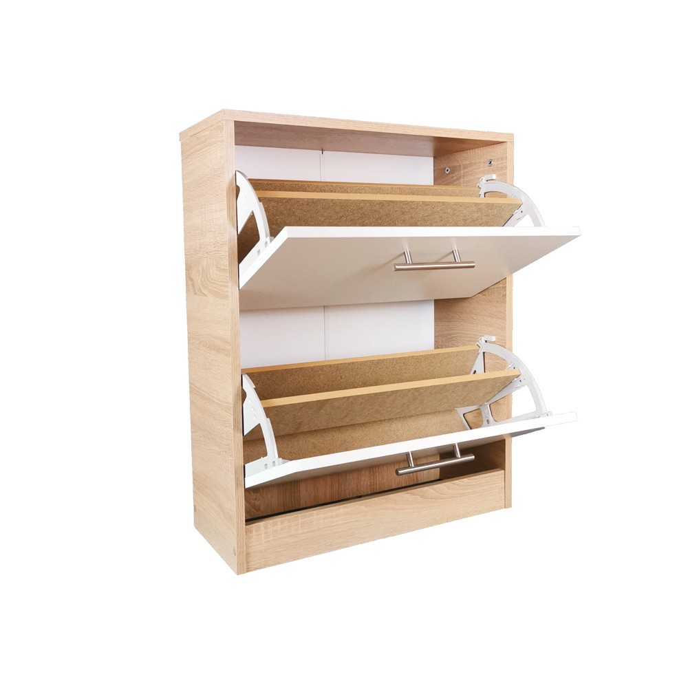Acest pantofar cu doua sertare isi gaseste locul in spatiile mai mici ale apartamentelor si caselor. Pantofarul are 2 rafturi rabatabile care oferta spatiu suficient pentru depozitarea incaltamintei.