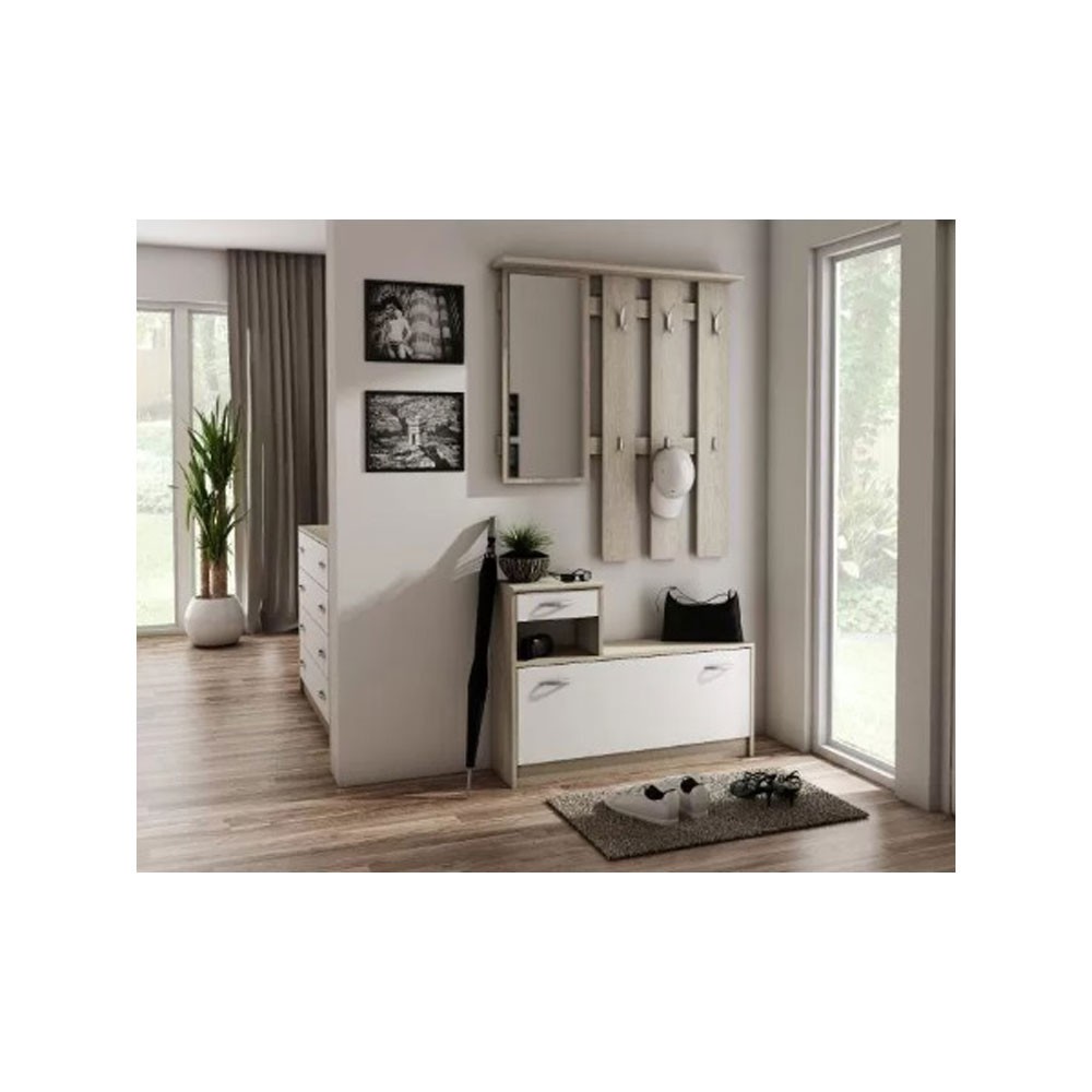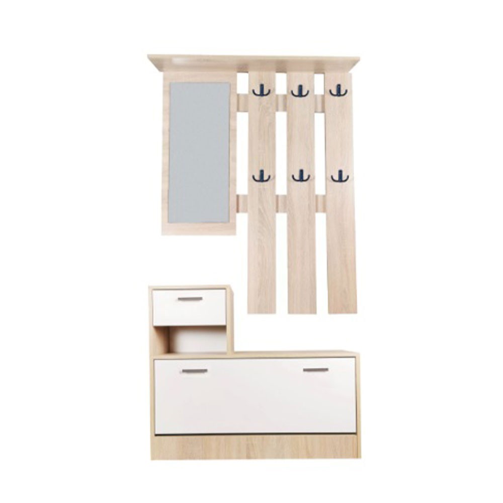 Setul de mobilier pentru hol, Filip este format din două părți care servesc diferitelor nevoi de organizare a articolelor de îmbrăcăminte și încălțăminte. Partea superioară este deschisă, se atașează de perete și este prevăzută cu oglindă, agățători și o poliță de dimensiuni reduse. Partea inferioară este închisă și este extrem de utilă pentru depozitarea pantofilor. Mai mult decât atât, cele două rafturi de dimensiuni mai mici construiesc un spațiu ideal pentru articole de decor sau obiecte îndrăgite, pentru a conferi personalitate spațiului în care pășiți prima dată în locuință.