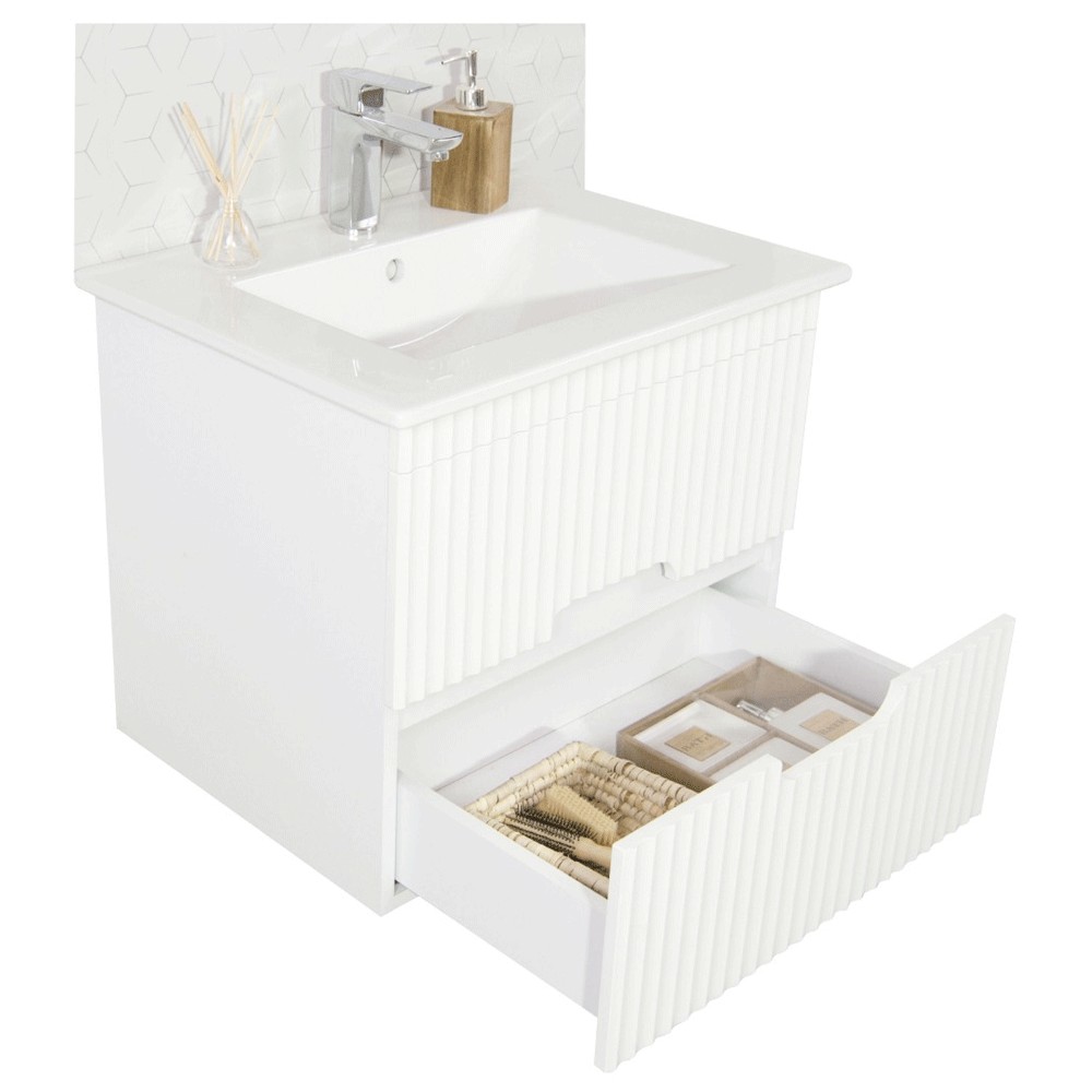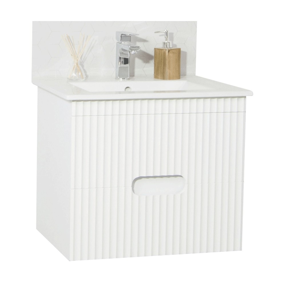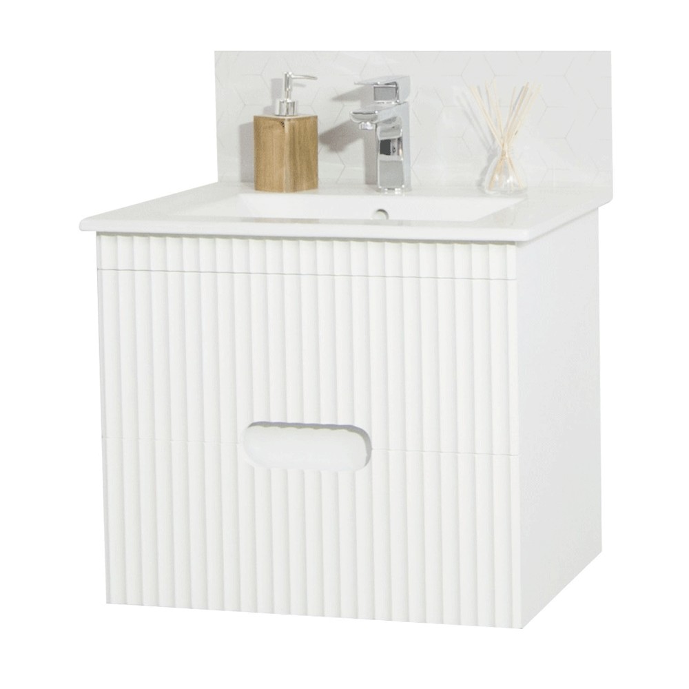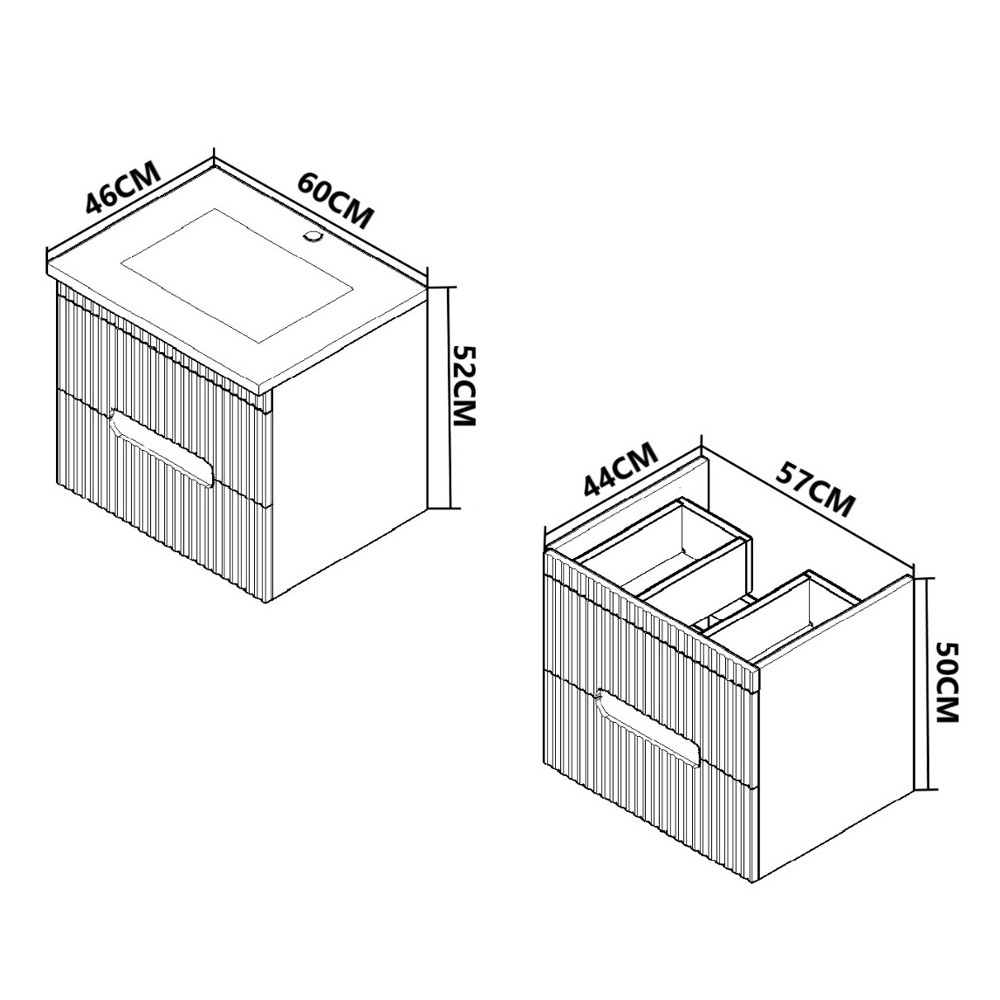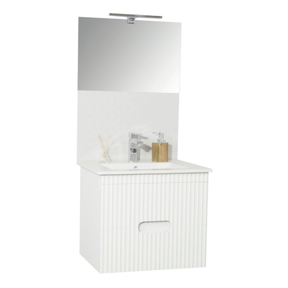 Elementul distinctiv al acestui set este frontul riflat din MDF infoliat. Acest detaliu subtil, dar de mare impact vizual, adauga textura si profunzime, transformand mobilierul intr-o piesa centrala a decorului. Designul suspendat, pe langa contributia estetica, ofera iluzia unui spatiu mai generos si faciliteaza curatenia sub mobilier, un aspect esential pentru o baie moderna.
