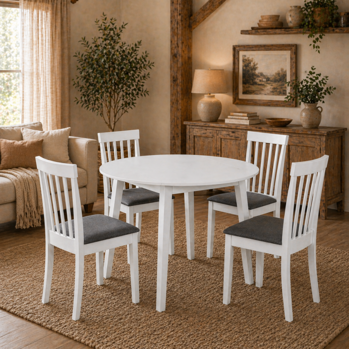 Set masa living plianta Philadelphia cu 4 scaune Houston, alb/gri, ideal pentru bucatarie sau living. Masa rotunda pliabila economiseste spatiu, iar structura din MDF si lemn masiv ofera durabilitate excelenta. Scaunele tapitate cu stofa gri asigura confort si eleganta in orice decor modern.