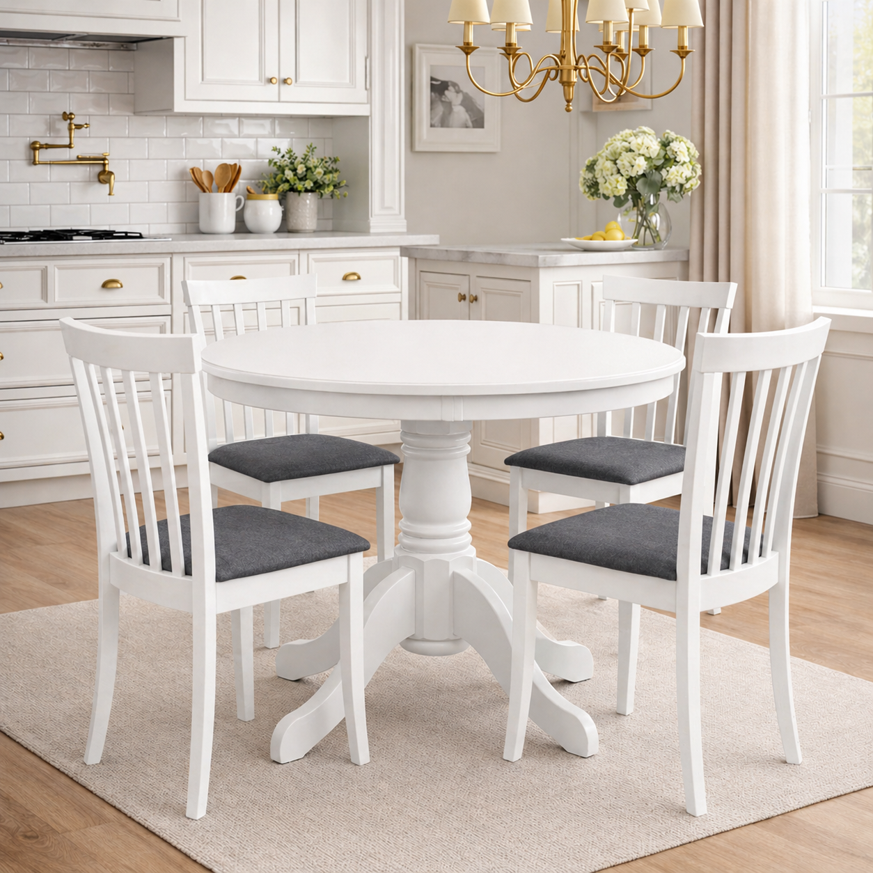 Set masa living rotunda Montreal + 4 scaune Houston, lemn masiv, MDF, stofa, alb/gri – eleganta moderna pentru un dining primitor