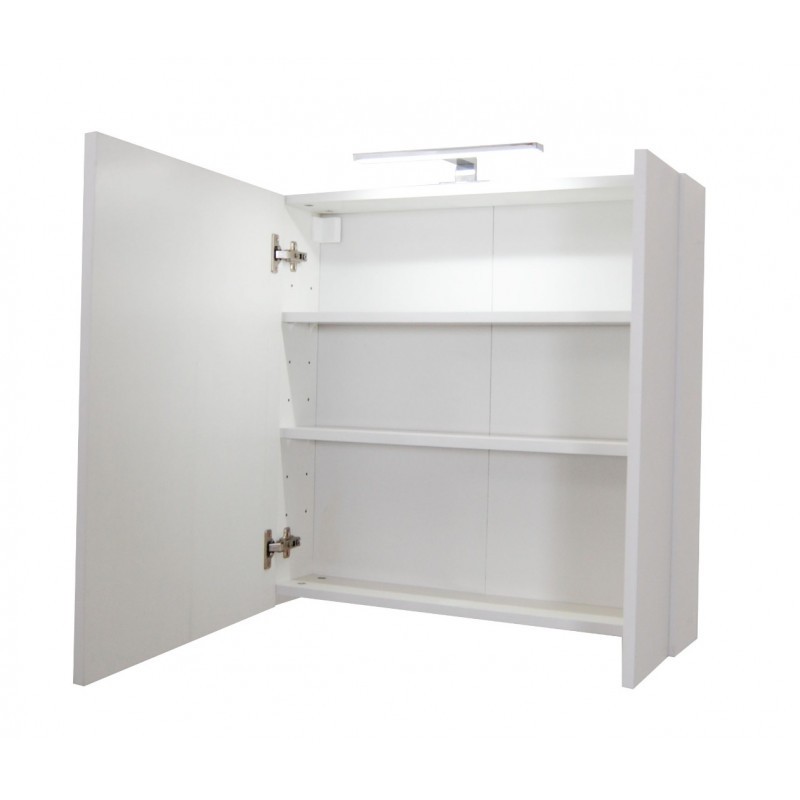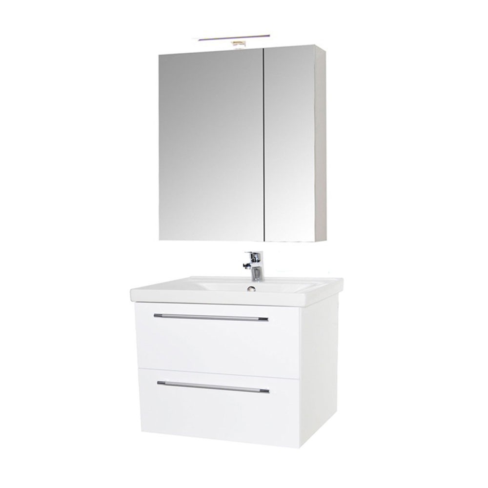 Set mobilier baie suspendat, cu lavoar ceramic, GN0541, front MDF, 60 cm, 2 sertare, glisiere soft close si dulap cu oglinda Celine, PAL, iluminare led, alb