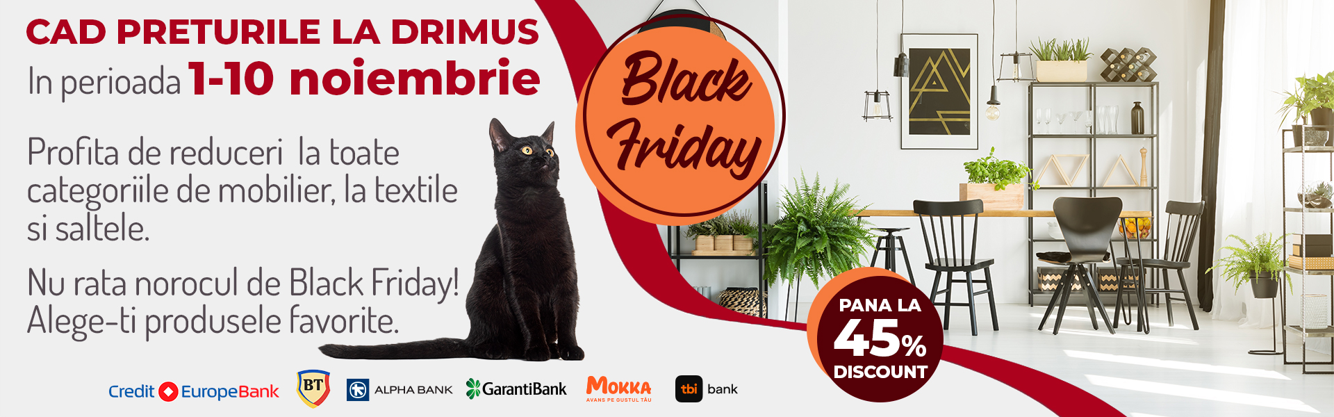 In perioada 1.11.2024 - 10.11.2024, la Drimus cad preturile. De ”Black Friday” pe drimus.ro gasiti mobilier, saltele si textile cu pana la 45% discount.
