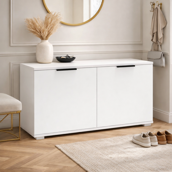 Finisajul alb ofera un aspect curat si luminos, contribuind la crearea unui hol aerisit si ordonat. Culoarea neutra permite integrarea usoara a pantofarului alaturi de alte piese de mobilier pentru hol, precum cuier, banca sau dulap pentru haine.