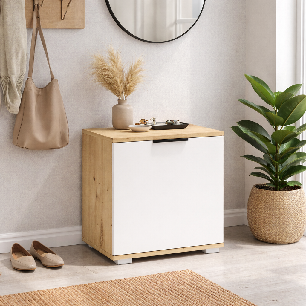 Pantofarul HM CLIF ST 50 alb – stejar artizanal este o piesa de mobilier compacta, conceputa pentru organizarea eficienta a incaltamintei in hol. Datorita dimensiunilor reduse si designului simplu, acest pantofar se integreaza usor in aproape orice spatiu, fiind ideal pentru apartamente, garsoniere sau holuri inguste.