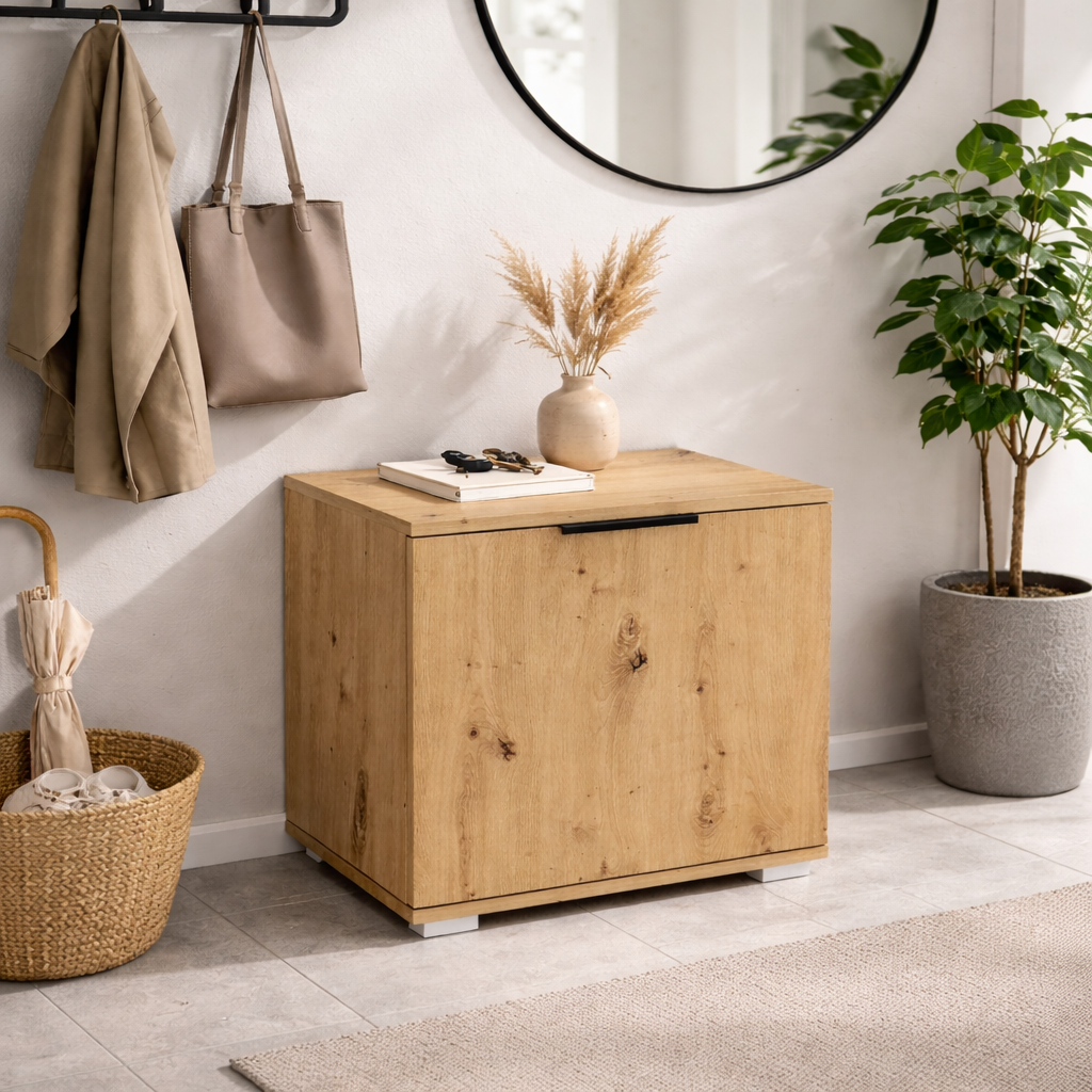 Realizat din PAL melaminat rezistent, pantofarul HM CLIF ST 50 este conceput pentru utilizare zilnica, oferind durabilitate si stabilitate. Finisajul in culoare stejar artizanal adauga un aspect cald si natural, fiind usor de integrat in amenajari moderne, clasice sau minimaliste.