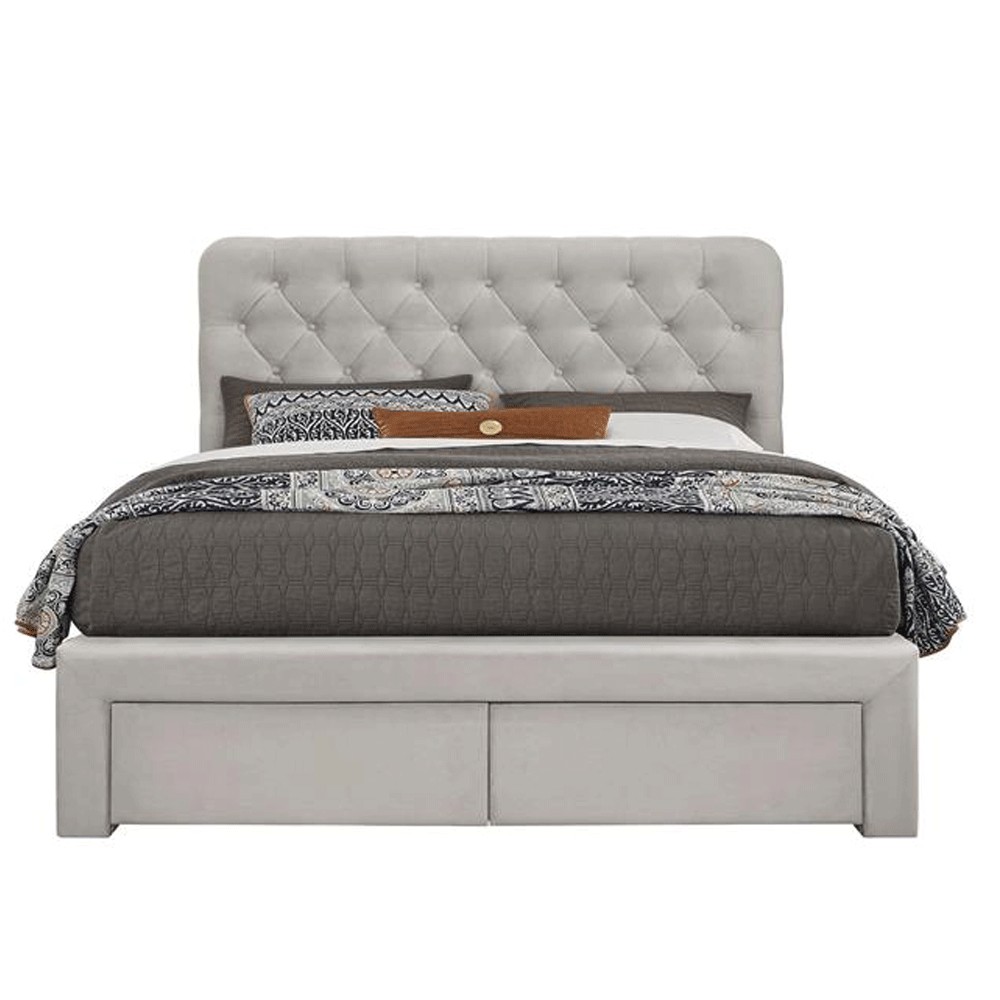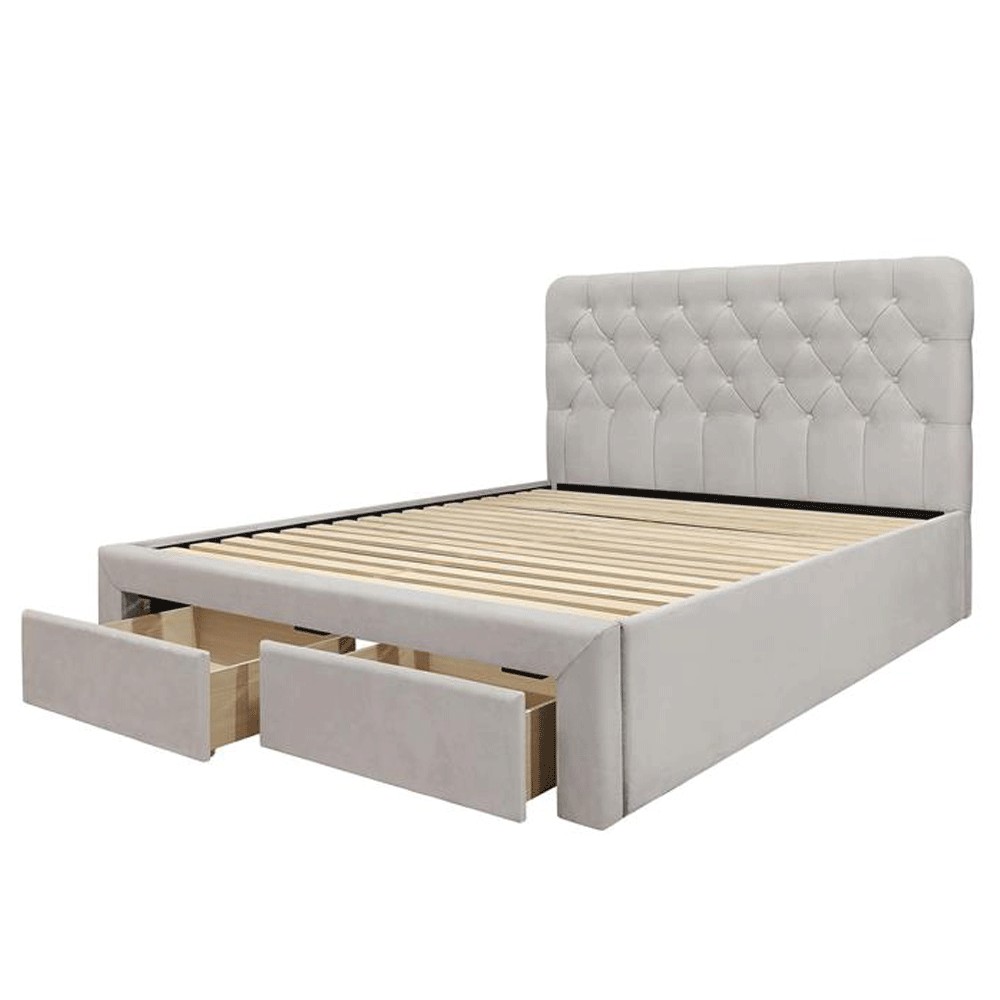 Redefineste stilul dormitorului tau cu patul HM Marisol, tapitat cu catifea fina bej si prevazut cu o tablie capitonata cu design sofisticat. Structura solida din lemn masiv si PAL de inalta calitate asigura durabilitate, in timp ce cele doua sertare integrate iti ofera spatiu suplimentar pentru organizare. Un pat modern si practic, ideal pentru un dormitor elegant si functional.