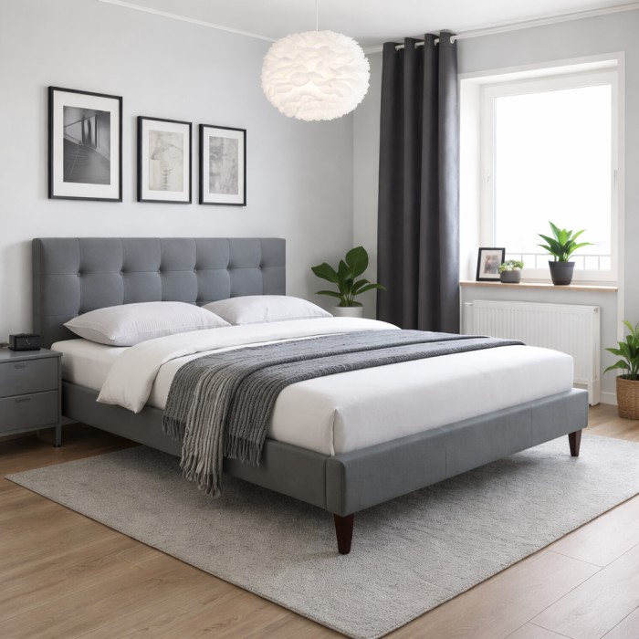 Patul tapitat HM Samara 2 beneficiaza de o structura robusta, realizata pentru a rezista utilizarii zilnice. Tapiteria din stofa de calitate, in nuanta eleganta de gri, este placuta la atingere, rezistenta si usor de integrat in diferite stiluri de amenajare – modern, minimalist sau contemporan.