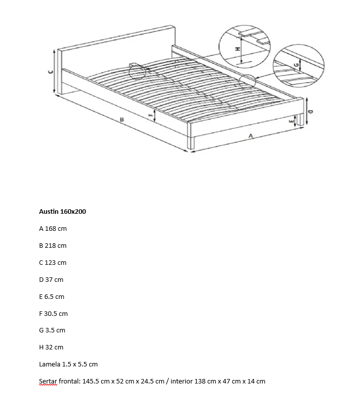 Construit pe un cadru solid din lemn masiv si sustinut de o structura metalica rezistenta, patul Austin garanteaza stabilitate pe termen lung, chiar si la utilizarea zilnica. Picioarele duble in forma de L sporesc siguranta si sustin aspectul modern al mobilierului, transformand patul intr-o piesa de rezistenta pentru dormitor.