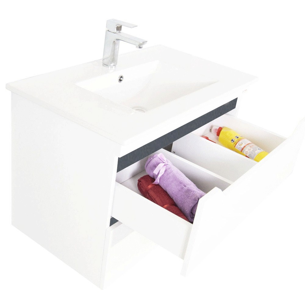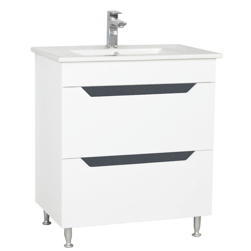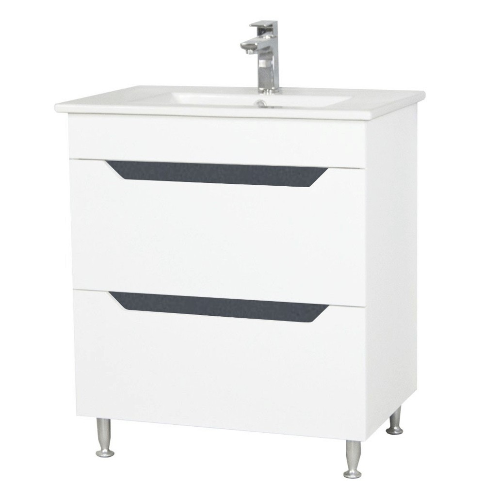 Baza si lavoar ceramic GN0561, mobilier baie stativ 70 cm, front MDF, 2 sertare, glisiere soft close, picioare cromate reglabile, alb/antracit