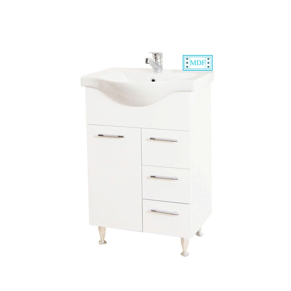 Baza si lavoar ceramic GN1531, mobilier baie stativ 55 cm, front MDF, 2 usi, 2 sertare, balamale soft close, picioare cromate reglabile, alb