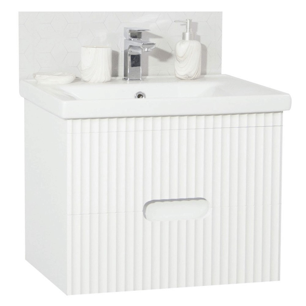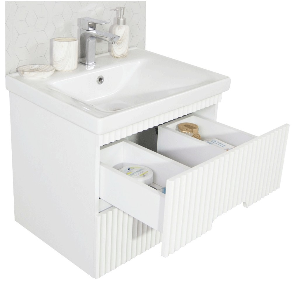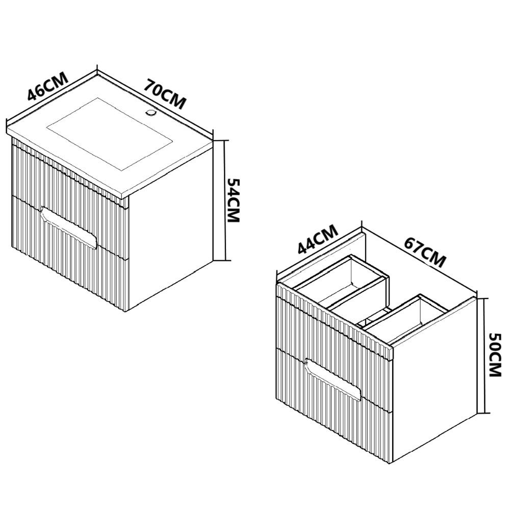 Baza si lavoar ceramic GN7091, mobilier baie suspendat 70 cm, dreptunghiular, front MDF riflat, sertare soft close, alb