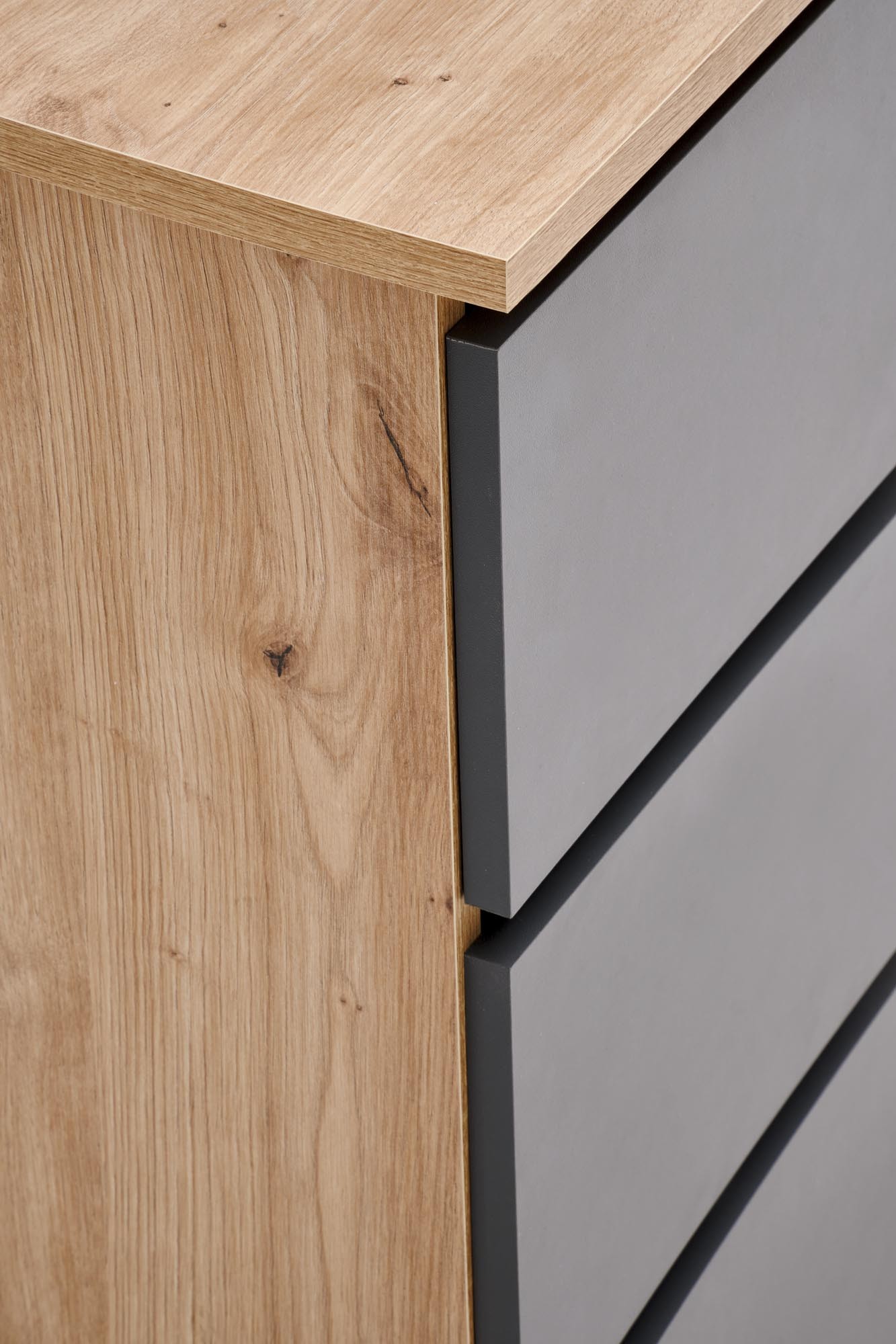 Un detaliu modern si de impact il reprezinta fronturile sertarelor in culoarea gri antracit, care adauga profunzime si contrasteaza placut cu nuanta naturala a stejarului. Acest mix de culori transforma biroul HM Cino intr-o piesa de mobilier usor de integrat in decoruri contemporane, scandinave sau industriale.