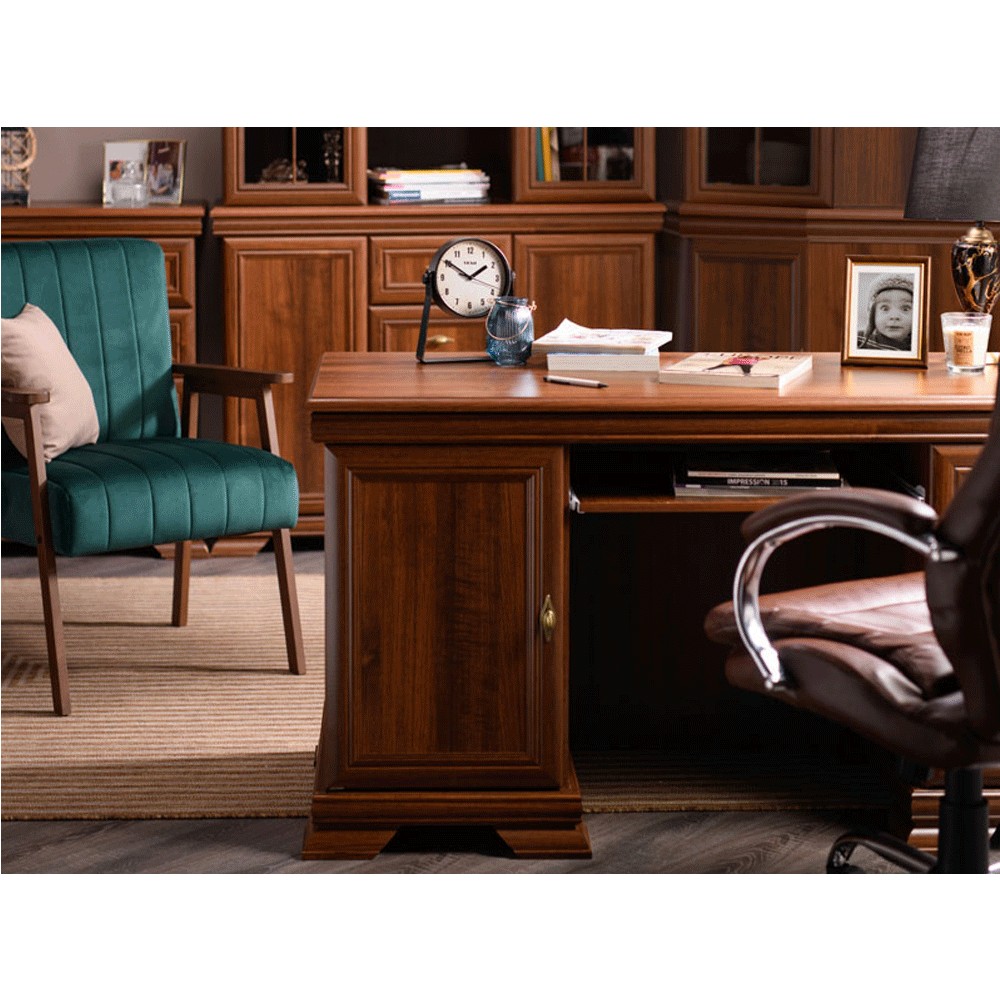 Fabricat din PAL Melaminat si decorat cu plinte din MDF, biroul VMB are multiple spatii de depozitare : 3 sertare, un compartiment cu usa in partea stanga si o polita culisanta pentru tastatura.Â