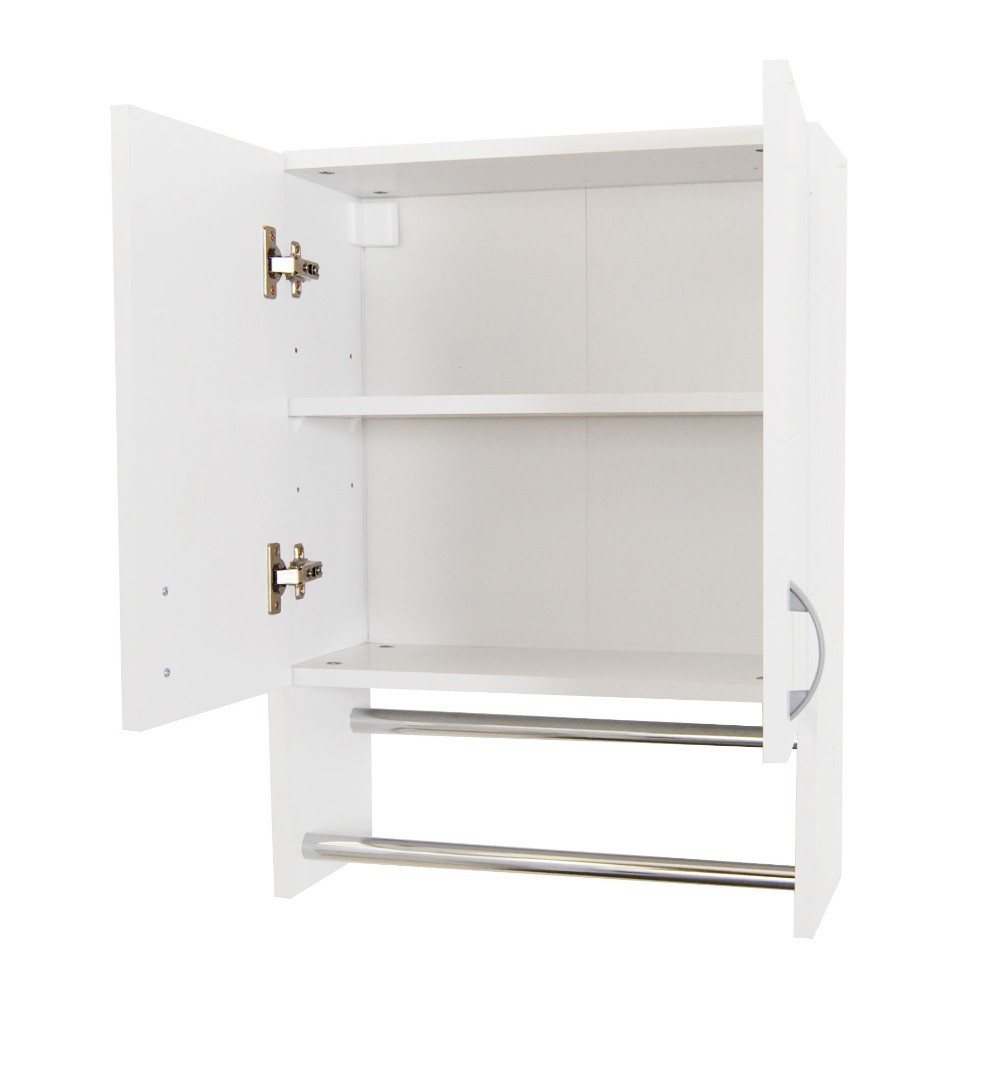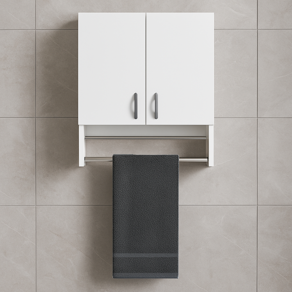 Un dulap complex ce satisface nevoi multiple : depozitare articole menajere si cosmetice in interior si suport pentru prosoape in exterior.Â