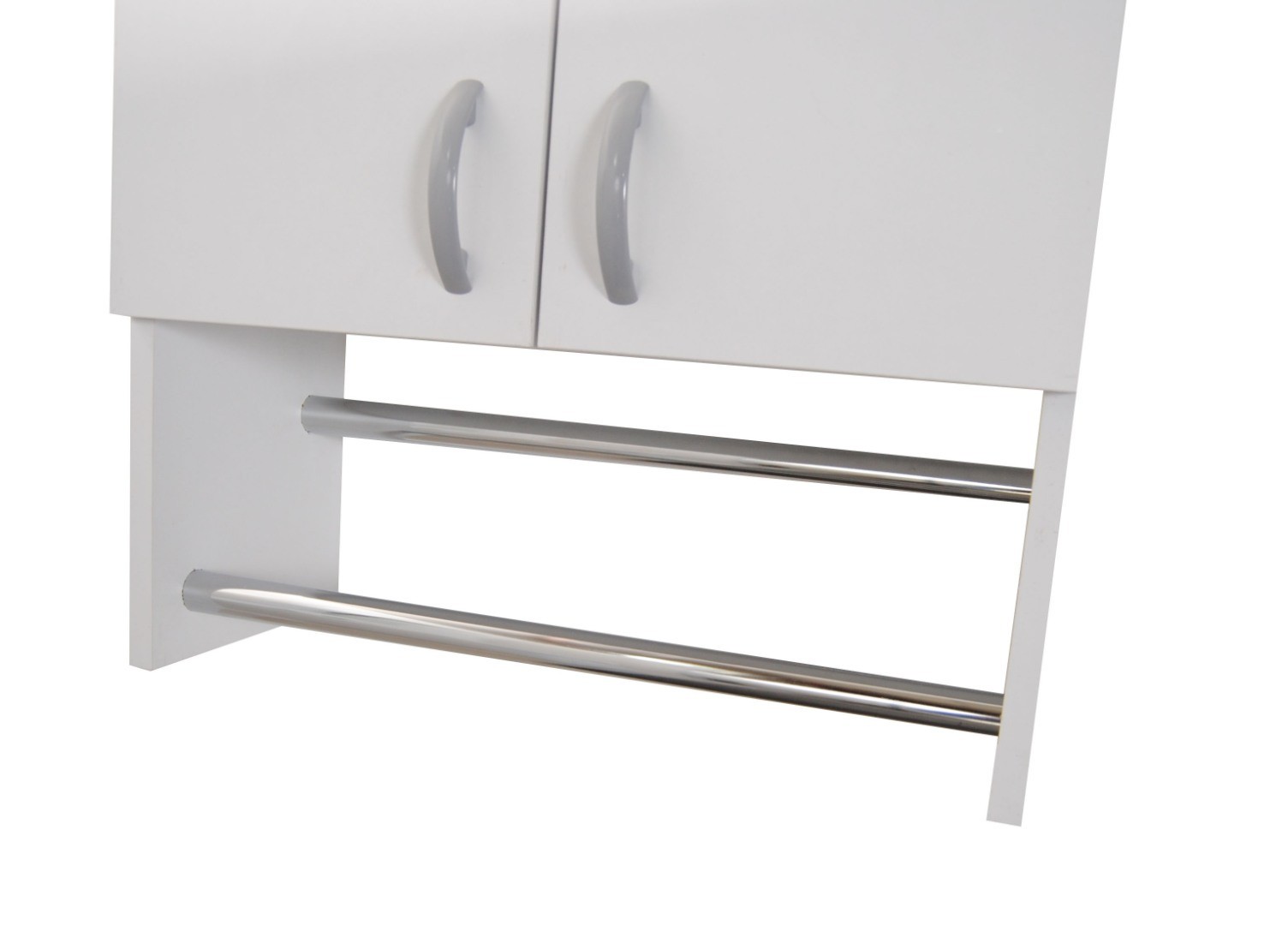 Carcasa dulapului este confectionata din PAL, usile din PAL lucios si cele 2 suporturi pentru prosoape sunt metalice, cromate. Toate materialele sunt tratate astfel incat sa reziste la mediul umed si coroziune.Â