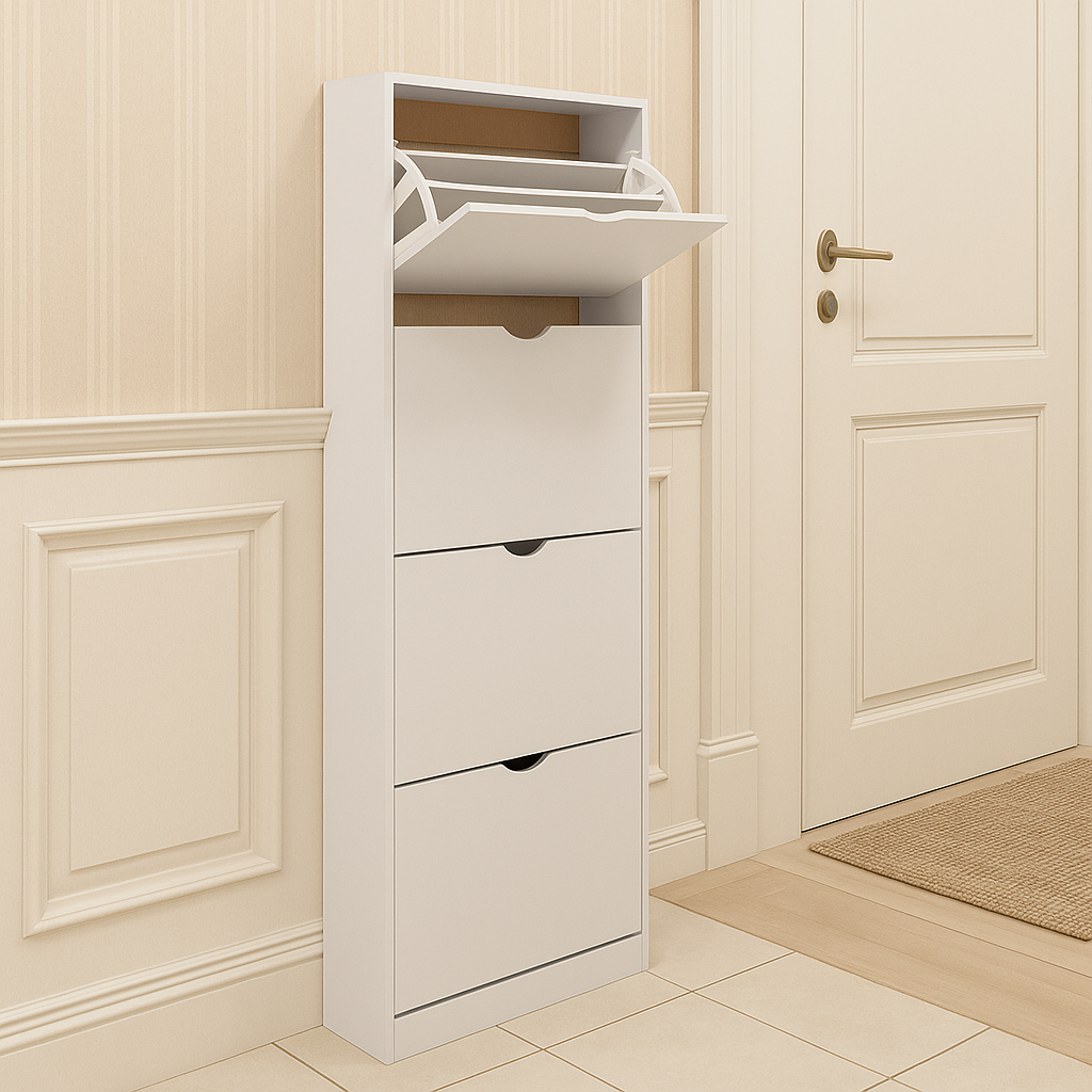 Spune adio pantofilor împrăștiați! Pantofarul KL Carey dispune de 4 sertare spatioase, fiecare echipat cu două rafturi interioare, oferind un spațiu generos pentru depozitarea eficienta a incaltamintei. Fie că ai pantofi casual, sandale elegante, mocasini confortabili sau papuci de casa, acest pantofar cu sertare asigură o organizare impecabila și un acces rapid la perechile tale preferate. Nu vei mai pierde timp căutând perechea potrivită! Datorită capacității mari de depozitare, fiecare tip de încălțăminte își va găsi locul, menținând holul ordonat.