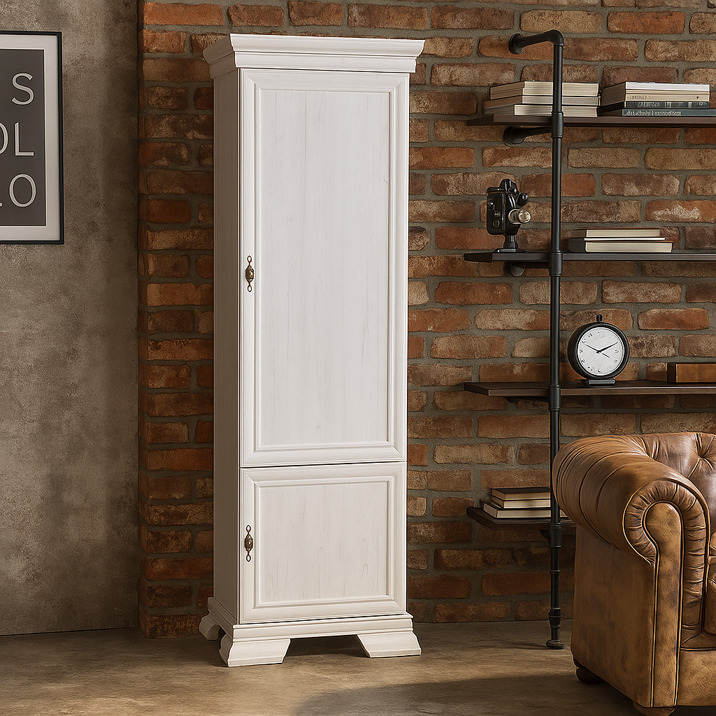 Dulap VMD1 Alb Antichizat asigura spatiu de depozitare vast datorita celor patru polite cu care este prevazut. Dulapul VMD1 este prevazut cu doua compartimente cu usi ce se deschid prin prinderea celor doua manere metalice aurii rustice. Acest corp de mobilier poate fi amplasat in living, dormitor, hol si chiar birou deoarece ocupa putin spatiu.Â