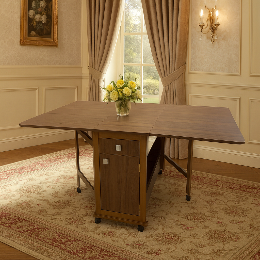Masa plianta cu usa si sertar este o masa foarte utila pentru cei care isi doresc o masa in living, dar nu dispun de spatiu suficient sau nu vor sa tina spatiul ocupat tot timpul cu o masa. Aceasta se pliaza si se depoziteaza cu usurinta intr-un colt al camerei, ea ocupand foarte putin loc – are latimea de 45 cm in pozitie pliata. Ea poate avea si o alta functionalitate atunci cand este stransa si anume poate servi drept suport pentru carti, reviste , obiecte decorative… Daca este extinsa, ea ofera un confort maxim pentru musafirii dumneavoastra, la ea putandu-se acomoda pana la 8 persoane.