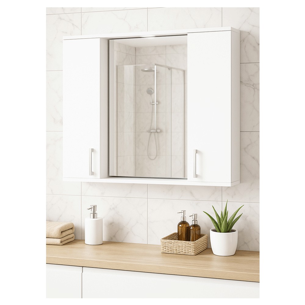 Oglinda de baie cu 2 dulapioare integrate pe stanga si dreapta reprezinta solutia perfecta pentru organizarea si optimizarea spatiului din baia ta, combinand functionalitatea cu designul modern. Aceasta oglinda compacta, cu dimensiuni ideale (L = 75 cm, H = 60 cm, l = 14 cm), este conceputa pentru a aduce un plus de eleganta si eficienta in orice amenajare de baie.