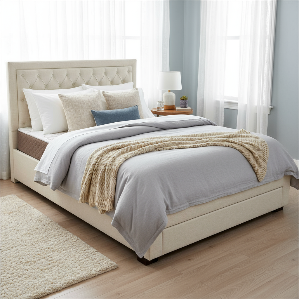 Cu patul tapitat Austin crem 160x200 cu sertar frontal, transformi dormitorul intr-un sanctuar al relaxarii si rafinamentului. Bucura-te de eleganta, confort si organizare, intr-o singura piesa de mobilier premium.