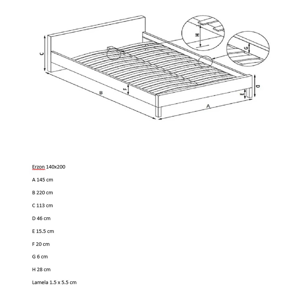 Pentru un confort sporit, patul Erzon este echipat cu o somiera robusta cu 24 de lamele flexibile, sustinute de o sina centrala din lemn ce stabilizeaza intreaga structura. Acest sistem asigura o aerisire eficienta a saltelei si sprijin uniform pentru un somn odihnitor.