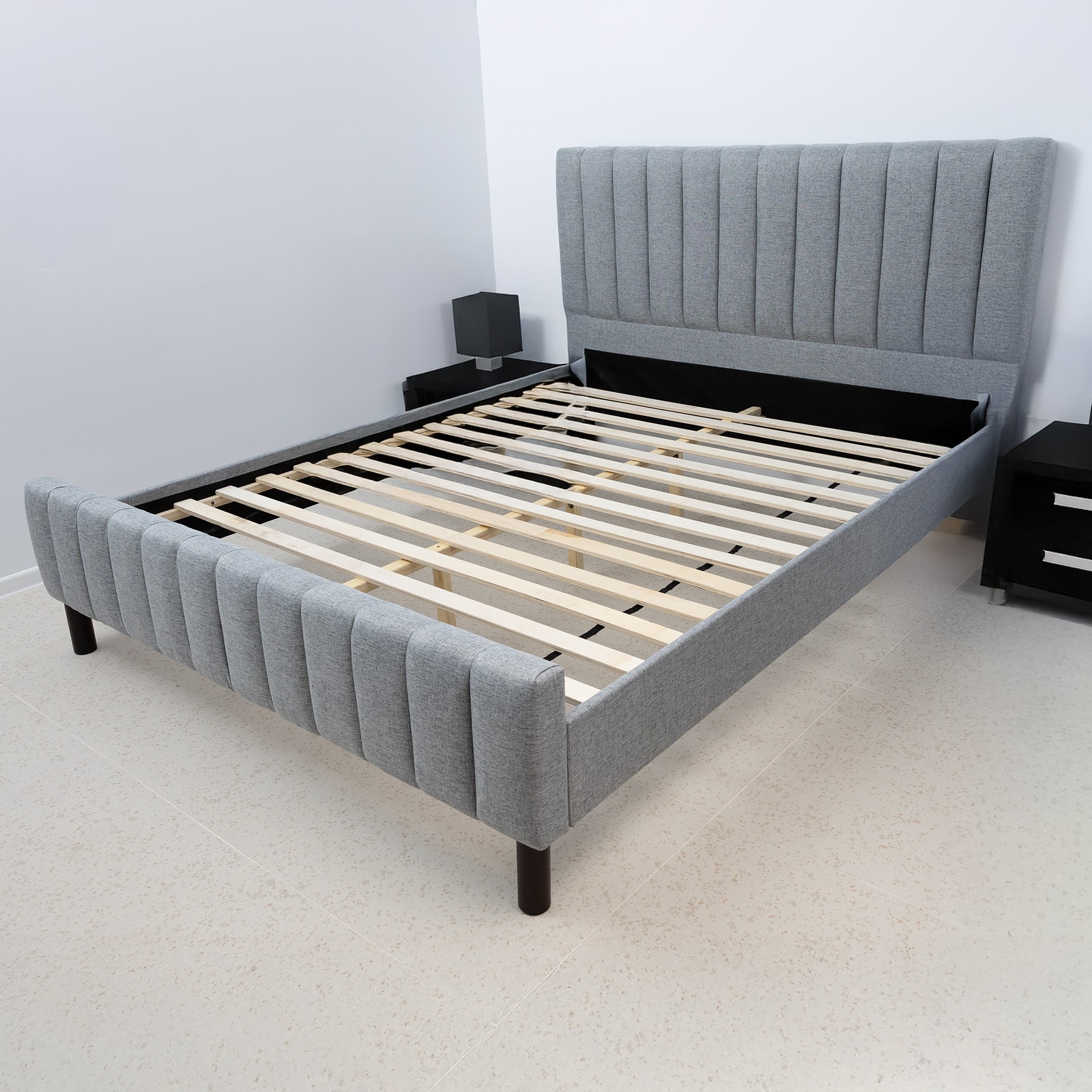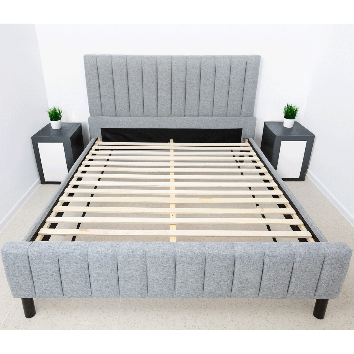 Construit pe o structura solida din lemn masiv, patul Erzon garanteaza rezistenta si stabilitate pe termen lung. Lateralele sunt realizate din PAL melaminat tapitat cu stofa gri de inalta calitate, conferind un aspect rafinat si usor de integrat in orice tip de decor – de la minimalist pana la clasic contemporan.