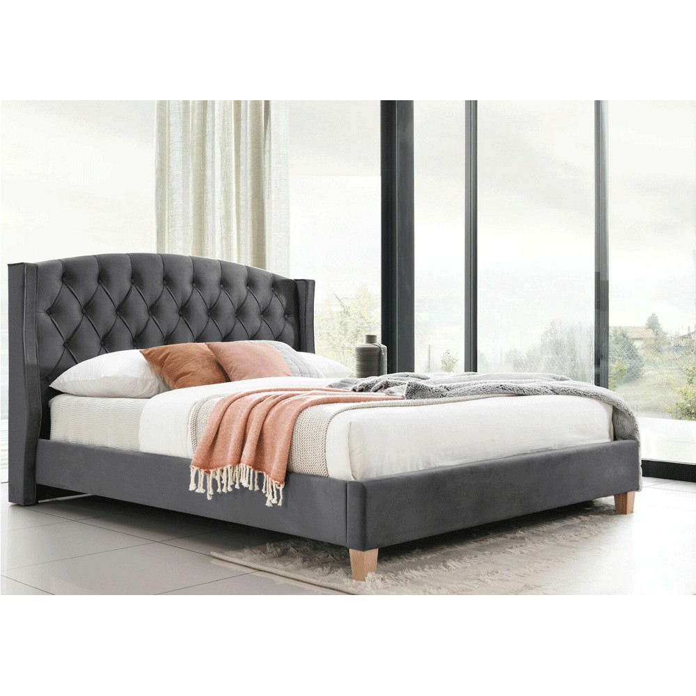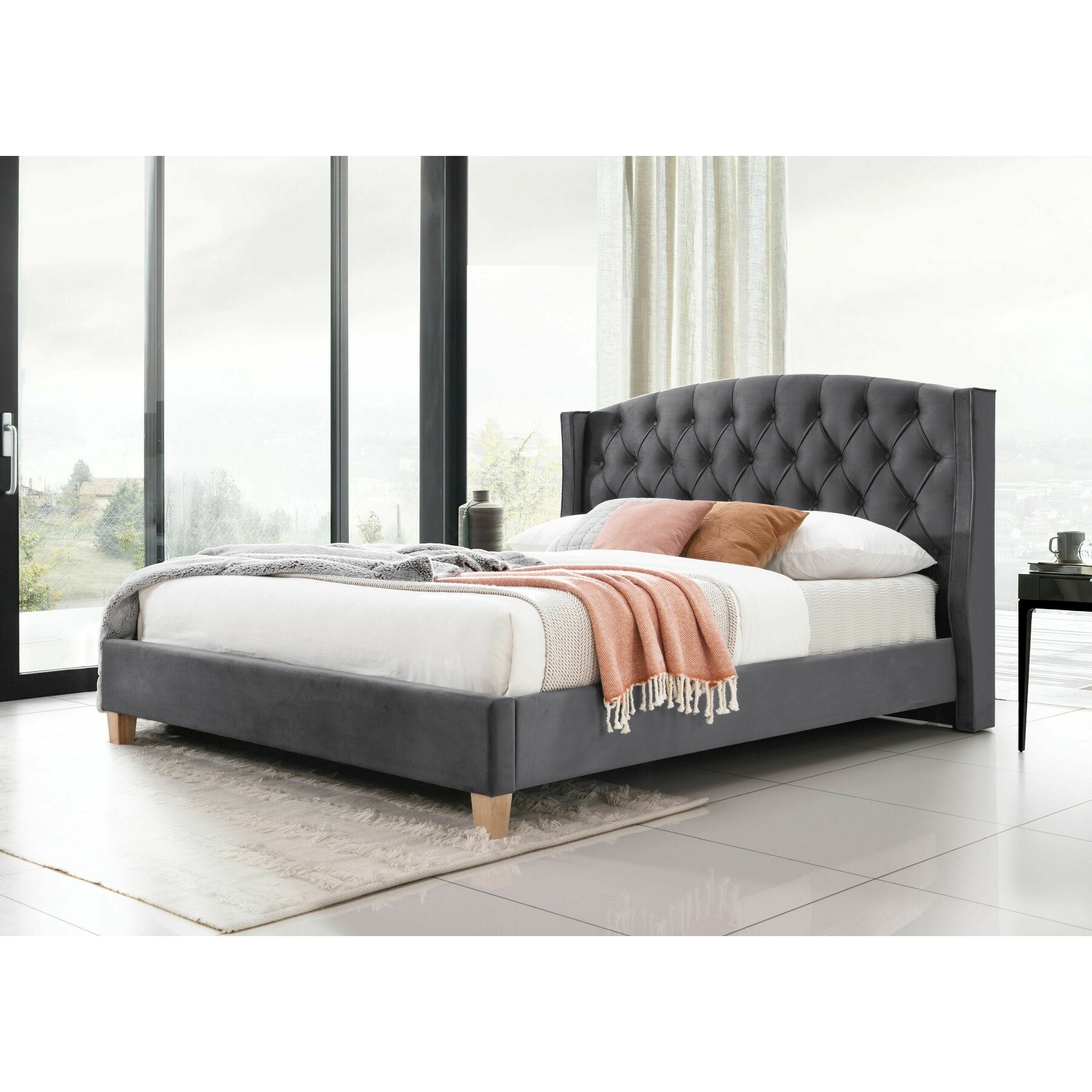 Cadru din lemn masiv, tapiterie din catifea gri, suport lamelar inclus.
