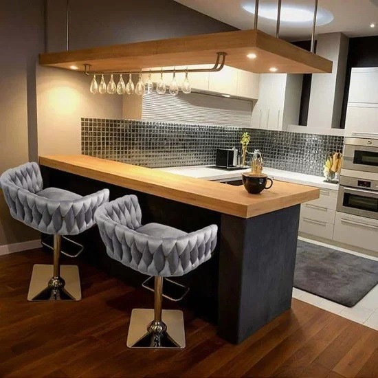 Adauga un plus de eleganta si rafinament bucatariei sau zonei tale de dining cu scaunul de bar ABS118P. Tapitat cu catifea moale si sustinut de o baza aurie reglabila, acest scaun ofera confort sporit si un design sofisticat, perfect pentru interioare moderne. Ideal pentru baruri, insule de bucatarie sau spatii cu stil.