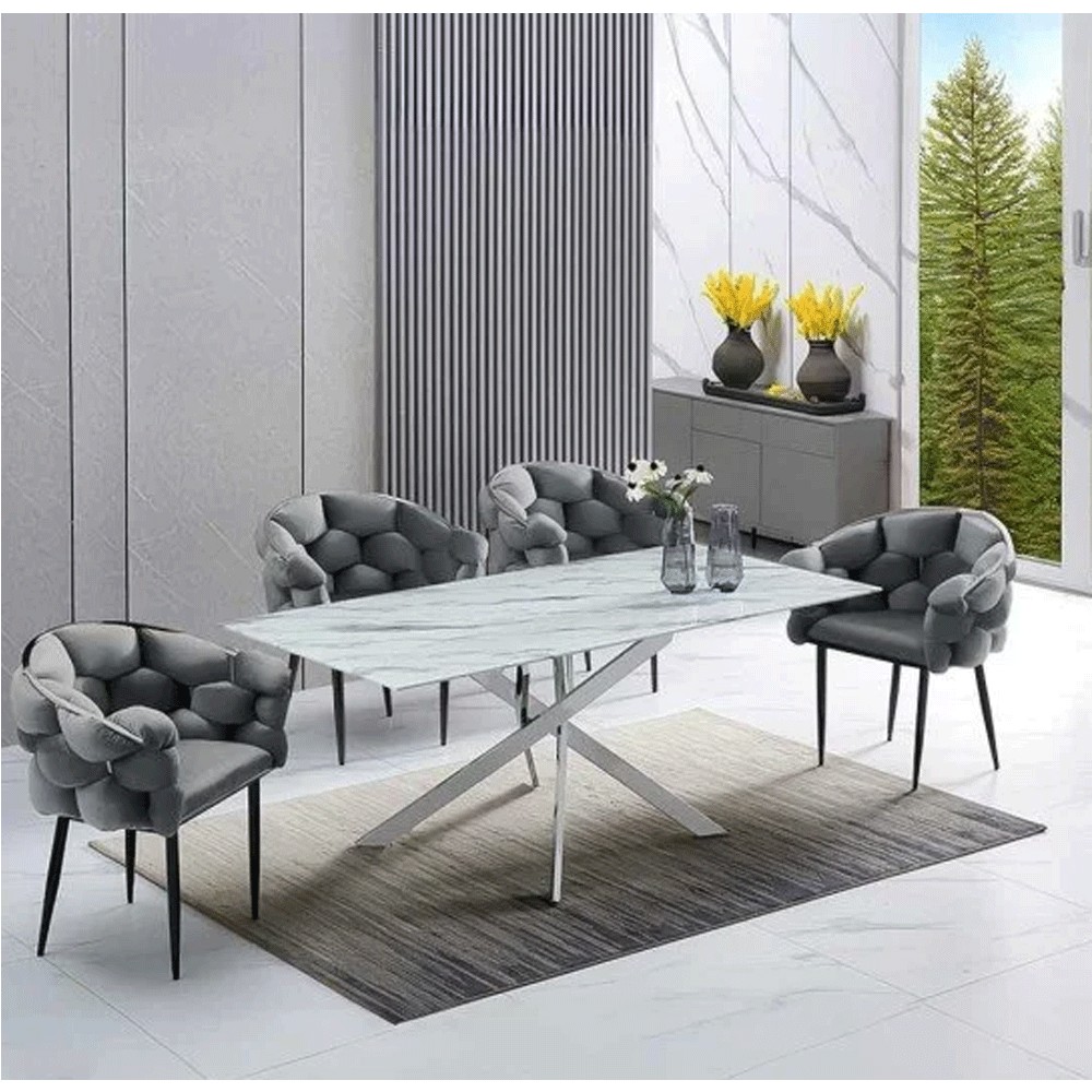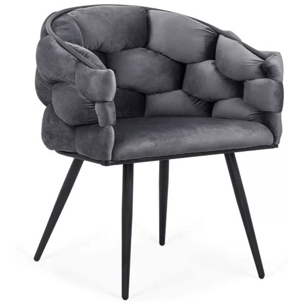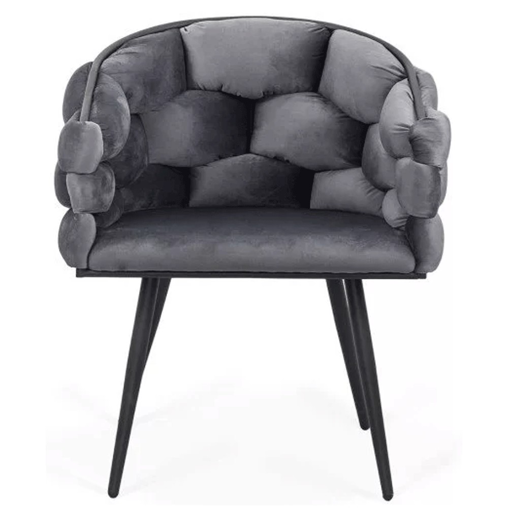 Scaunul living din catifea BUC256 este o alegere remarcabila, captand privirile prin detalii deosebite. Scaunul impresioneaza prin dimensiunile sale generoase si sezutul adanc, avand forma unui fagure care confera o perceptie unica mobilierului. Structura sa se bazeaza pe picioare metalice.