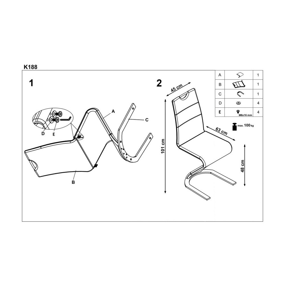 Structura scaunului K188 este din metal vopsit iar sezutul si spatarul sunt imbracate in piele ecologica. Spatarul scaunului este prevazut cu maner, pentru a putea fi mutat cu usurinta.