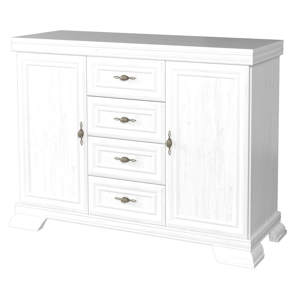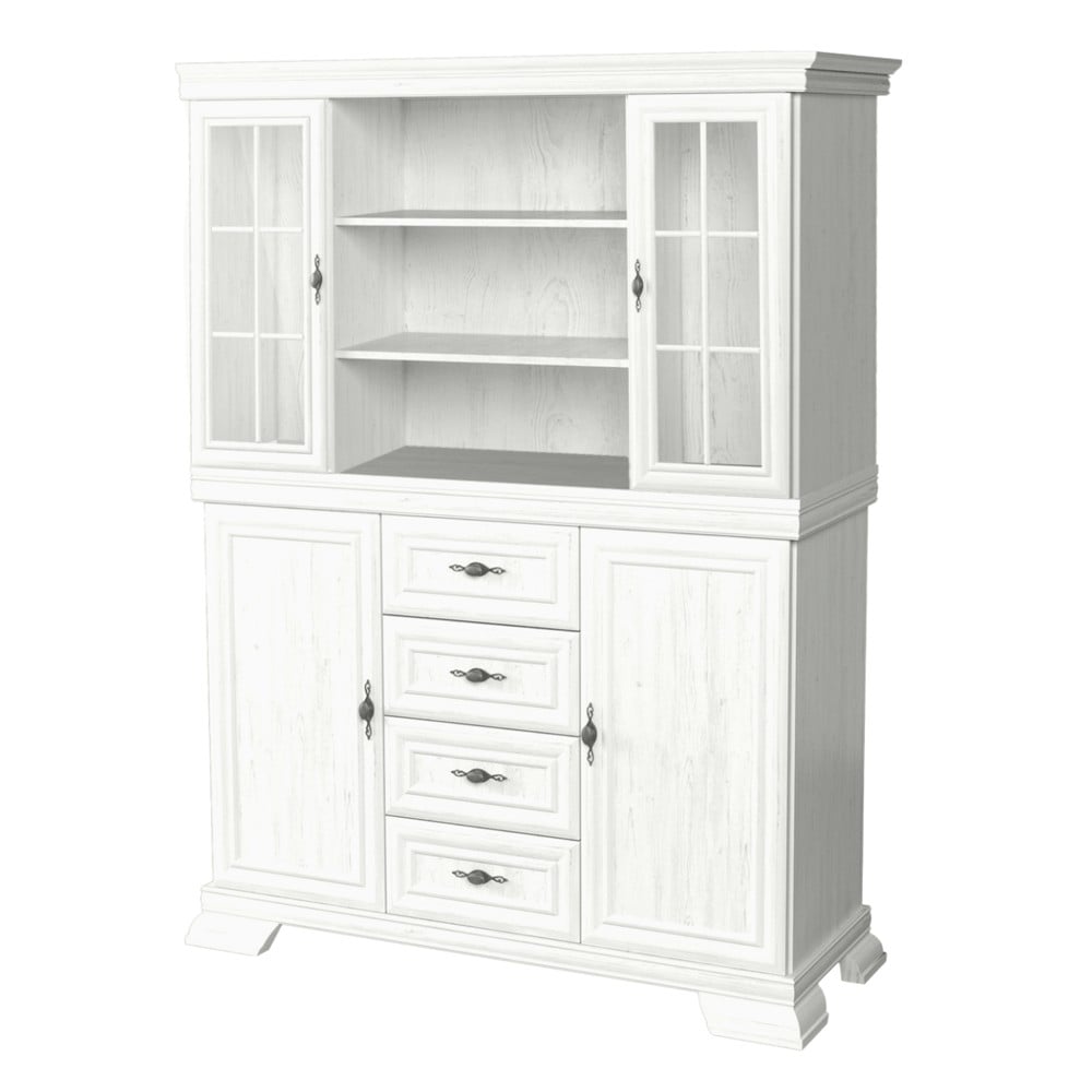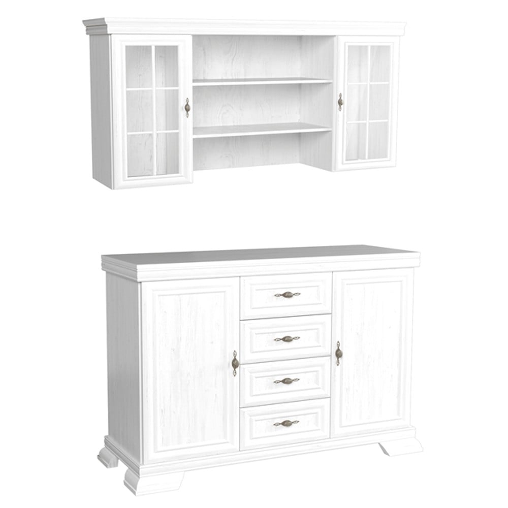 Comoda este conceputa din PAL Melaminat si plinte decorative din MDF cu manere metalice aurii, iar vitrina este prevazuta cu doua usi acoperite cu sticla.