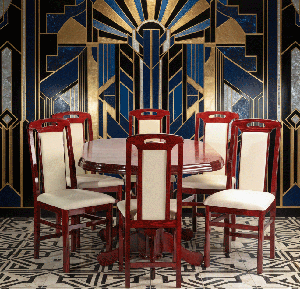 Masa extensibila cu blat din MDF furniruit lacuit si structura din lemn masiv lacuit este o masa impunatoare, eleganta, potrivita incaperilor in stil clasic.