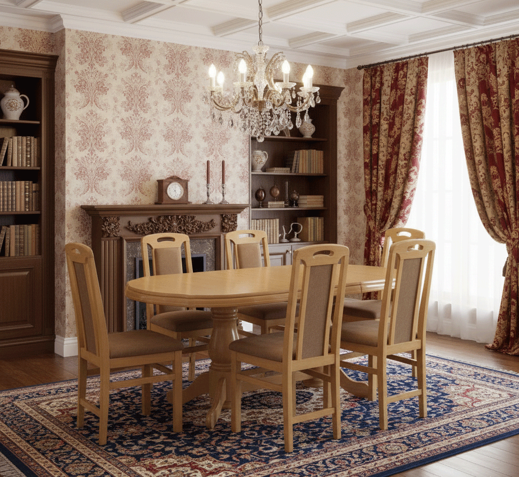 Masa extensibila cu blat din MDF furniruit lacuit si structura din lemn masiv lacuit este o masa impunatoare, eleganta, potrivita incaperilor in stil clasic.