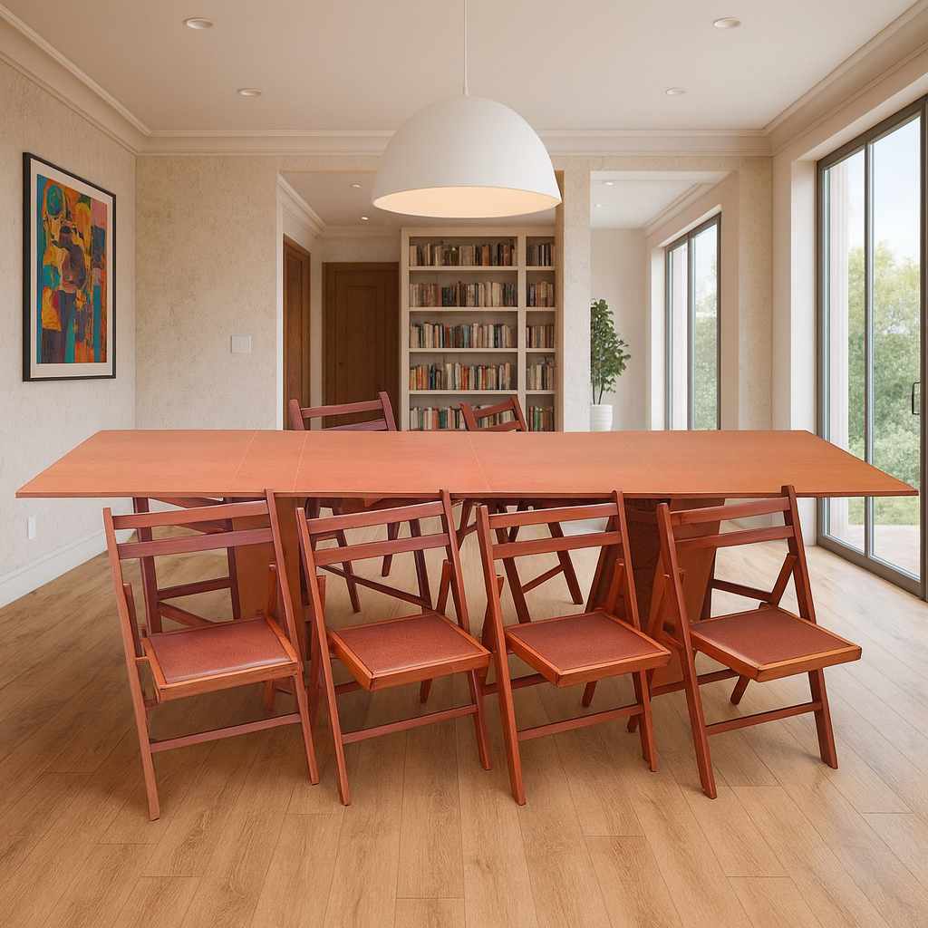 Setul contine o masa plianta de 12 persoane (compusa din doua mese de 6 persoane, prinse intre ele cu sistem de cuplare metalic) si 6 scaune pliante tapitate.