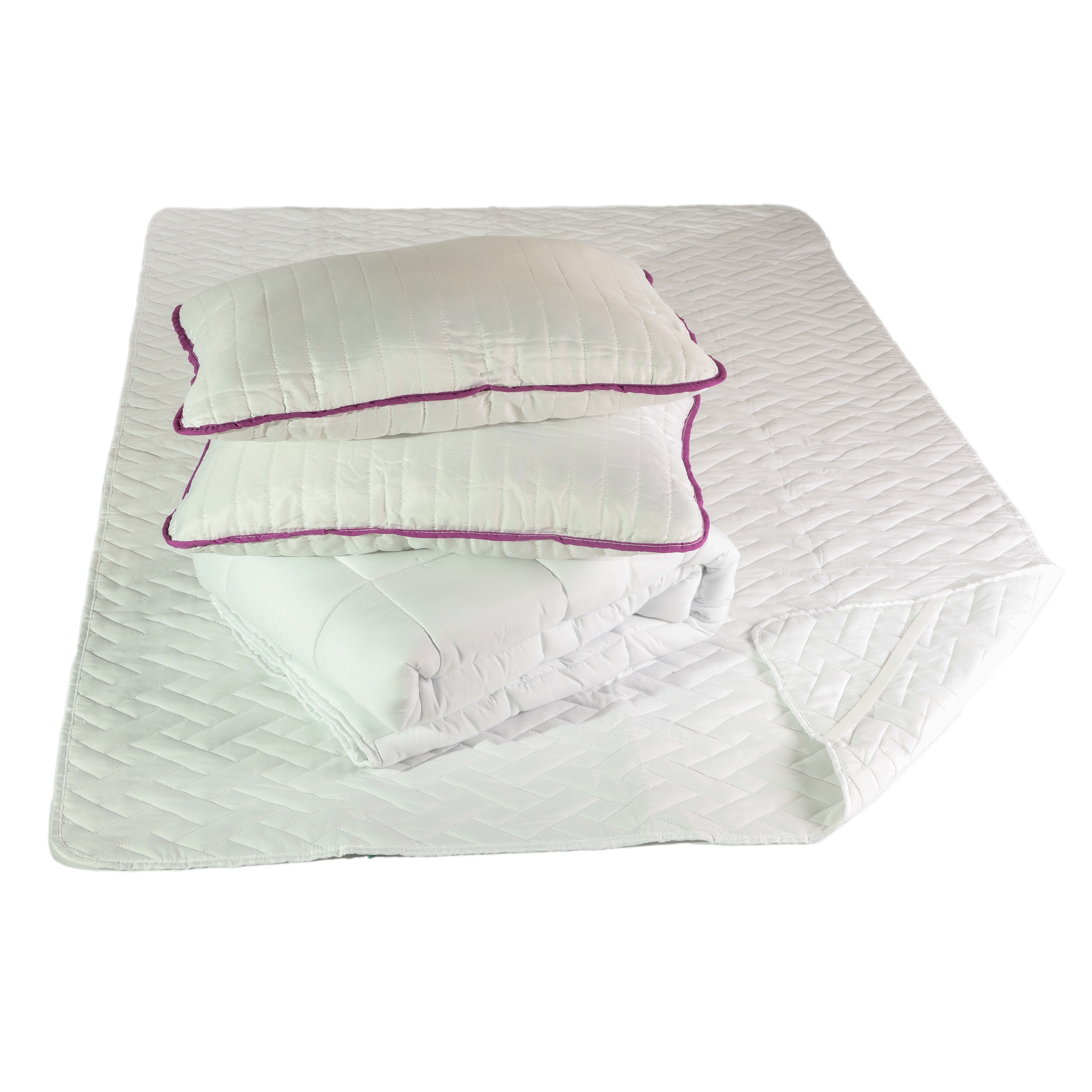 Tesatura alba microfibra poliester 100% lavabila la 95 °C fara contractii, moale la atingere, periată ("soft touch, brushed"). Spalarea la o temperatura de 95 °C reduce sansa de supravietuire a acarienilor si a bacteriilor la minim.