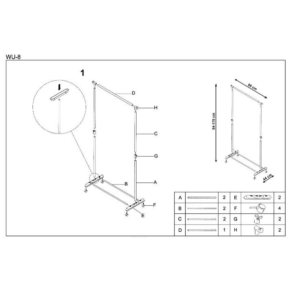 Stender cromat cu elemnte din plastic si suport de incaltaminte HM WU8 este reglabil pe inaltime 94 - 170 cm prevazut cu rotile pentru a-l deplasa cu usurinta acolo unde aveti nevoie de el. Suportul de umerase HM WU8 ofera un cadru modern pentru pastrarea si aranjarea hainelor dumneavoastra, care se integreaza foarte bine in special in hoteluri, restaurante, birouri sau dormitoare.